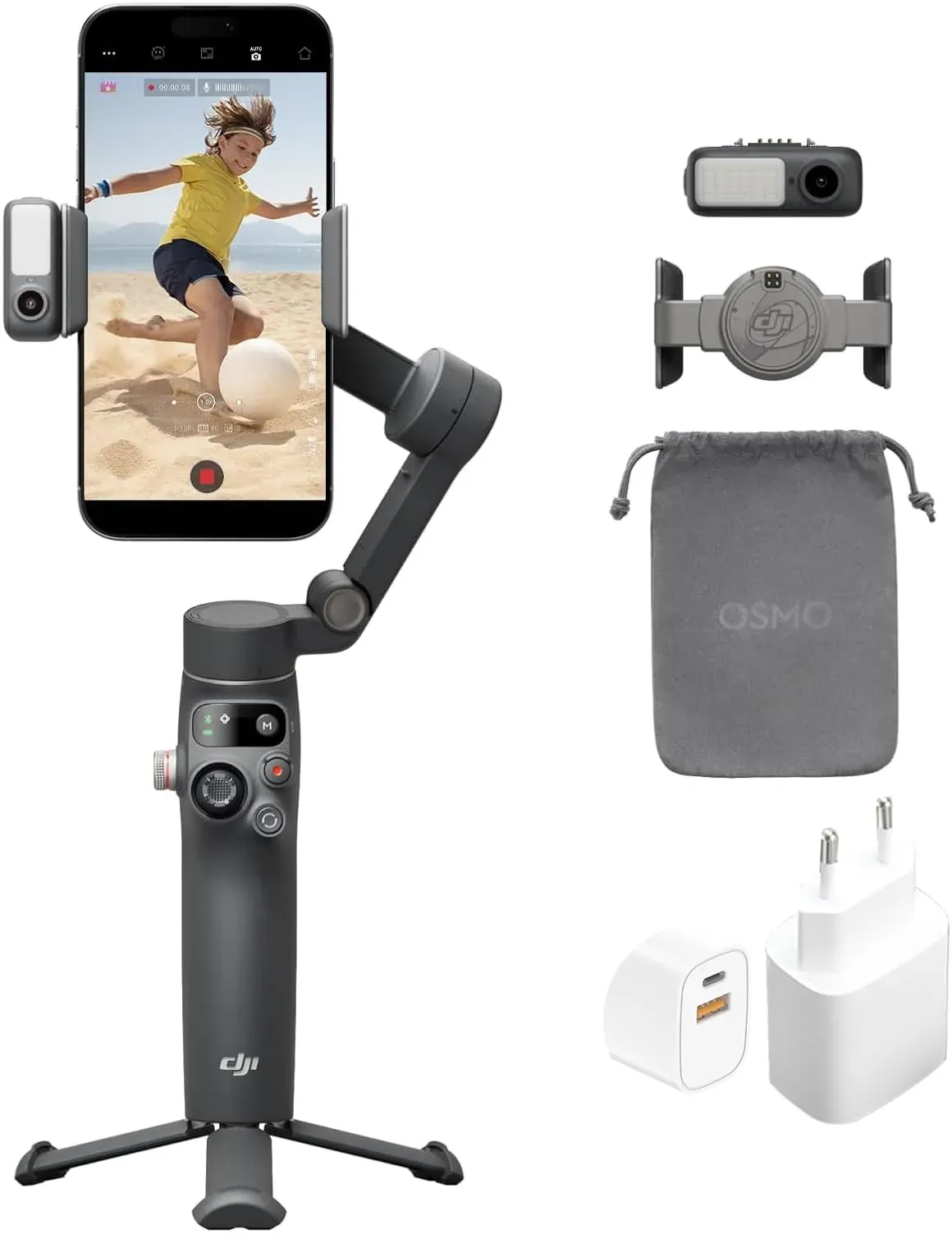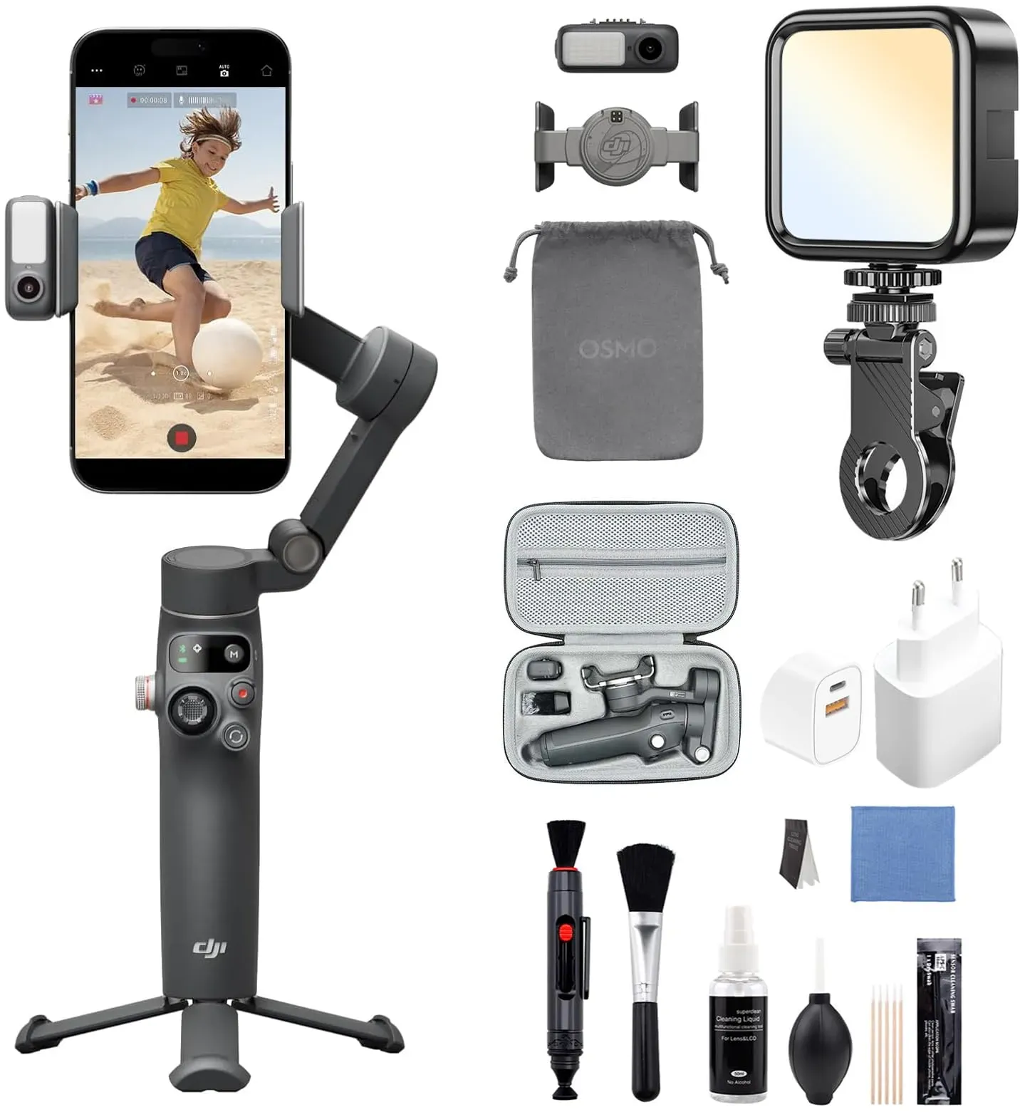 Kategorie: Handy-Gadgets - DJI - GTIN:0190021126022 - Extra vielseitiges Zubehör - Um Ihnen die Nutzung zu erleichtern und der Marktnachfrage gerecht zu werden, bieten wir Ihnen zusätzlich eine Praktische Tragetasche. All diese Teile können perfekt an die Osmo Mobile 7P angepasst werden. Fange das Spektakuläre ein - Das Multifunktions-Modul vereint intelligentes Tracking, DJI Mic Mini Empfänger und Beleuchtungsfunktionen in einer kompakten Einheit. Kombiniere es mit deinem Handy-Gimbal für ideale Aufnahmen jedes Mal. Erlebe nahtlose Stabilität - Die robuste Stabilisierung des auf drei Achsen stabilisierten Gimbals des Osmo Mobile 7P sorgt für verlustfreie Stabilität. Fange kreative Ausbrüche ein und erschaffe mühelos atemberaubende Meisterwerke in Kinoqualität. Wie ein Profi von Anfang an aufnehmen - Kombiniere dein Osmo Mobile 7P mit DJI Mimo für ShotGuides und One-Tap Bearbeitung. Filme und bearbeite wie ein Profi, spare Zeit und verbessere sofort dein kreatives Storytelling. So schnell, so einfach - Klappe den Gimbal auf, um ihn einzuschalten. Montiere ein gekoppeltes Smartphone einfach mit dem magnetischen Design, und die Mimo-App öffnet sich automatisch [3], sodass du sofort filmen kannst. Vereinfache deine Kreativität - Der integrierte Verlängerungsstab und das Stativ [4] des Osmo Mobile 7P ermöglichen es dir, mühelos weite Selfies und stabile Vlogs aufzunehmen und bieten kreative Freiheit ohne den Aufwand zusätzlicher Ausrüstung. Stärke deine stabile Kreativität - ... Ein erweitertes Bundle mit Ladestecker, Fülllicht, Reinigungsset und Tragetasche, das ein hervorragendes Preis-Leistungs-Verhältnis bietet. ![]() ![]() DJI Osmo Mobile 7P Bundle Gimbal-Stabilisator für iPhone, Android, Natives Tracking, Beleuchtung, 3-Achsen-Smartphone-Gimbal, schneller Start (Ladestecker+Fülllicht+Reinigungsset+Tragetasche)