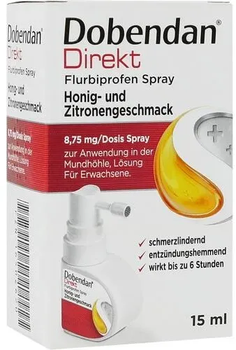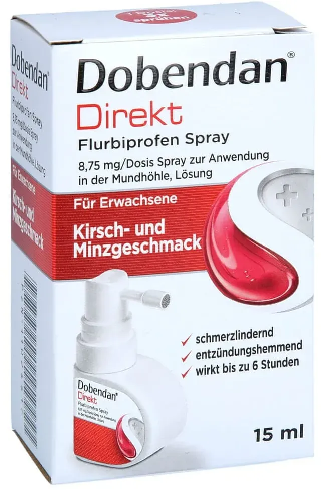 666,00 /l - Kategorie: Arzneimittel - RB Deutschland GmbH - GTIN:4002448060888 - PZN:11024417 - Dobendan Direkt Flurbiprofen Spray 8,75 mg/Dosis 15 ml - von Reckitt Benckiser Deutschland GmbH - Kategorie: Halsschmerzen - Versand: 2,95 , ab 18 versandkostenfrei - 9,99 Euro bei healthii - gefunden von billiger.de Diese 36er Packung Lutschtabletten ist eine beliebte Wahl im Amazon Marketplace und bietet eine gute Menge für den Preis. ![]() ![]() DOBENDAN Direkt Flurbiprofen 8,75 mg Lutschtabl,36St