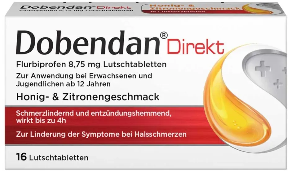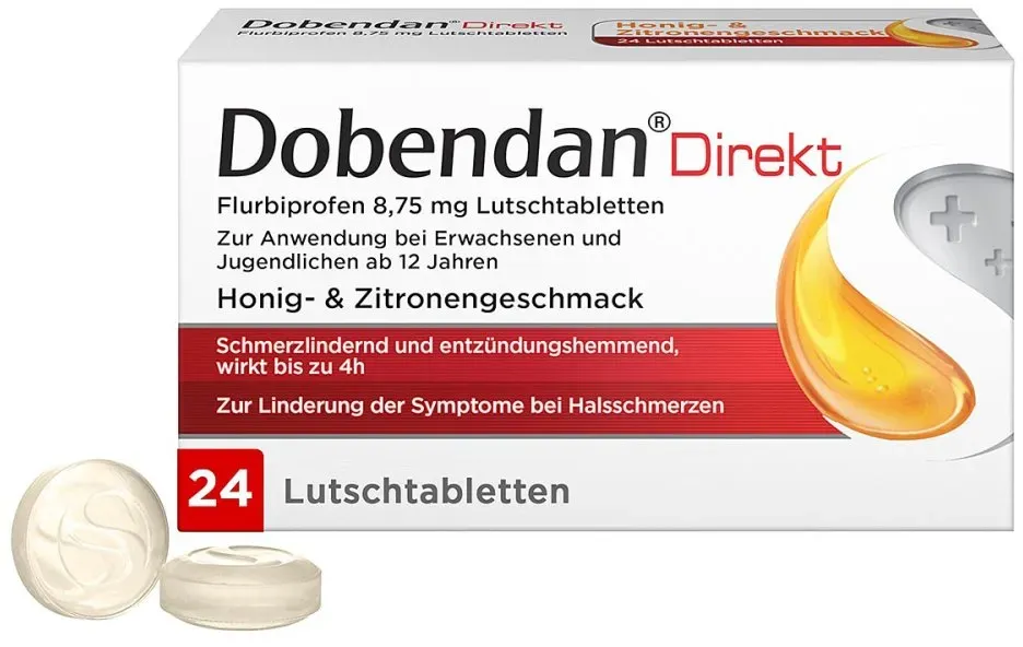 Zustand: Neu - 0,37 € / Stück - Erkältung & Grippe Medikamente bei Erkältung - DOBENDAN Reckitt Benckiser Deutschland GmbH - 06866410 - EAN: 4150068664105 - Bei Schluckbeschwerden und starkem Halsschmerz wirken die Dobendan Direkt Halspastillen schmerzlindernd und entzündungshemmend bis tief ins Gewebe ohne dabei zu betäuben Lang anhaltende Schmerzlinderung bis zu 4 Stunden: Der Wirkstoff Flurbiprofen dringt tief ins Gewebe ein und lindert nicht nur die Schmerzen, sondern bekämpft die Entzündung auch dort, wo sie sitzt Wenn betäubende Halstabletten zur schnellen und dauerhaften Linderung der Halsentzündung nicht mehr ausreichen, ist das gut verträgliche Flurbiprofen besonders geeignet; Wirkung bereits nach 20 Min. Anwendung: Erwachsene und Kinder ab 1 n lassen je nach Bedarf alle 3-6 Stunden eine Tablette im Mund zergehen (max. 5 Lutschpastillen pro Tag); Mit angenehmem Honig-Zitronen Geschmack Lieferumfang: 1 x 24 Dobendan Direkt Flurbiprofen Lutschtabletten 8,75 mg; 24 entzündungshemmende, abschwellende Lutschdragees zur symptomatischen Linderung von starkem bis sehr starkem Halsweh Zu Risiken und Nebenwirkungen lesen Sie die Packungsbeilage und fragen Sie Ihren Arzt oder Apotheker. - 18 Händler im amazon.de Marketplace Dieses Angebot für 9.95 Euro ist eine solide Wahl für Dobendan Direkt Lutschtabletten in einer gängigen Packungsgröße. ![]() ![]() RB Deutschland GmbH Dobendan Direkt Lutschtabletten gegen Halsschmerzen