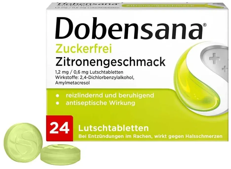 Zustand: Neu - 0,21 € / Stück - Erkältung & Grippe Medikamente bei Erkältung - DOBENSANA Reckitt Benckiser Deutschland GmbH - 3061605 - EAN: 4002448119159 EAN: 4150111280689 EAN: 4002448089773 - DER HELFER BEI LEICHTEN HALSSCHMERZEN: Dobensana Junior bietet eine effektive Schmerzlinderung bei Halsweh für Kinder ab n - mit leckerem Erdbeergeschmack ANBIETER & HINWEISE: Reckitt Benckiser Deutschland GmbH. Arzneimittel aus der Apotheke (PZN 11128074). Zu Risiken und Nebenwirkungen lesen Sie die Packungsbeilage und fragen Sie Ihren Arzt oder Apotheker Ohne Antibiotika,Zucker- und farbstofffrei ZWEI ANTISEPTISCHE WIRKSTOFFE: Die zwei antiviralen und antibakteriellen Wirkstoffe Amylmetacresol (AMC) 0,6 mg und 2,4-Dichlorbenzylalkohol (DCBA) 1,2 mg ergänzen sich synergetisch ANWENDUNG : Falls vom Arzt nicht anders verordnet, nehmen Erwachsene und Kinder ab n bei Bedarf alle 2-3 Stunden 1 Lutschtablette, die sie langsam im Mund zergehen lassen. Die Tagesdosis sollte 8 Lutschtabletten nicht überschreiten. Wichtig: Sollten die Beschwerden länger als 3 Tage anhalten und/oder mit hohem Fieber, Kopfschmerzen, Übelkeit oder Erbrechen einhergehen, kontaktieren Sie bitte Ihren Arzt. ¹In-vitro-Test. - 24 Händler im amazon.de Marketplace Dieses Angebot bietet Dobensana Zuckerfrei Zitrone Lutschtabletten zu einem attraktiven Preis für leichte Halsschmerzen. ![]() ![]() Dobendan Dobensana Zuckerfrei Zitrone Lutschtabletten 1,2mg/0,6mg €“ Halstabletten zur Schmerzlinderung bei leichten Halsschmerzen & Schluckbeschwerden €“ 1 x 24 Tabletten