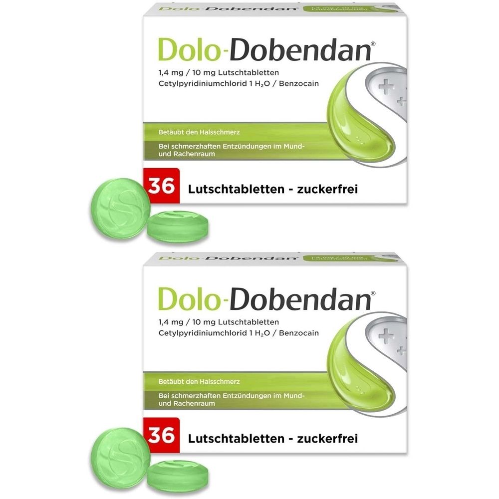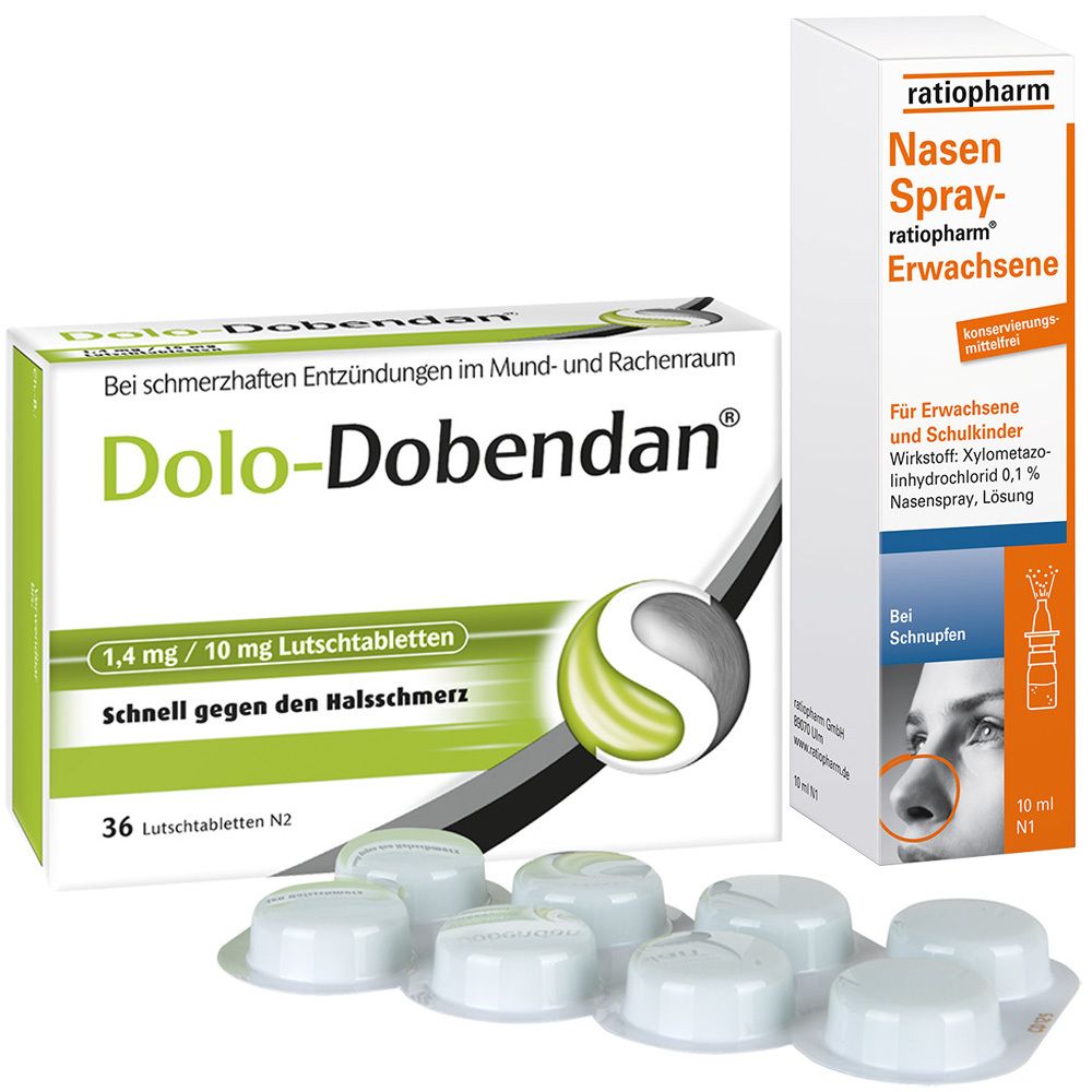 Zustand: Neu - 0,34 € / Stück - Erkältung & Grippe Medikamente bei Erkältung - DOBENDAN Reckitt Benckiser Deutschland GmbH - 12700079 - EAN: 4150127000790 - Durch lokale Betäubung sorgt Dolo-Dobendan für eine schnelle Schmerzlinderung bei starken Halsschmerzen & bekämpft mit seiner desinfizierenden Wirkung die Erreger der Entzündung Schnelle Hilfe bei Halsweh: Bereits nach 46 Sek. lindern die Halstabletten mit dem Wirkstoff Benzocain die Schmerzen & wirken so schnell & effektiv gegen den Halsschmerz Der Wirkstoff der Halspastillen wirkt der Halsentzündung antibakteriell direkt in Hals & Rachen entgegen Anwendung: Kinder ab n nehmen alle 4 Stunden eine Tablette ein (max. 4 Lutschpastillen pro Tag) / Kinder ab 12 J. & Erwachsene nehmen je nach Bedarf alle 2 Stunden eine Tablette (max. 8 am Tag) Lieferumfang: 1 x 36 Dolo-Dobendan Lutschtabletten 1,4mg/10mg / 36 Lutschdragees zur schnellen Schmerzlinderung bei starken Halsschmerzen durch Entzündungen im Mund- & Rachenraum - 19 Händler im amazon.de Marketplace Dieses Erkältungsset kombiniert Dolo-Dobendan mit Nasenspray und ist eine praktische Lösung für umfassende Erkältungssymptome. ![]() Erkältungsset Dolo-Dobendan® + Nasenspray-ratiopharm® 1 St Set