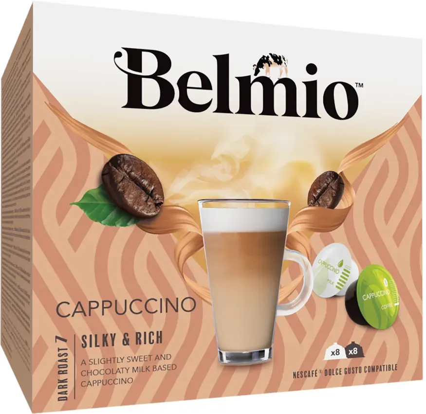 Verfügbarkeit: 2 Ã 5 jours - Kategorie: Kaffee & Espresso - Belmio - GTIN:5415150800113 - Belmio Dolce Gusto Cappuccino 16 Kapseln Dieser Belmio Dolce Gusto Cappuccino kommt in einer Packung mit 16 Kapseln, perfekt für den Genuss eines leckeren Cappuccinos zu Hause. Zutaten: - Kaffee - Milch - Zucker Nährwertinformationen: Pro Portion Menge Kalorien 60 Protein 2g Fett 3g Kohlenhydrate 7g Bitte beachten Sie, dass dieses Produkt Allergene wie Milch enthalten kann. Bitte überprüfen Sie die Zutatenliste vor dem Verzehr. - 4,09 Euro bei capalus.de - gefunden von billiger.de Für Starbucks-Liebhaber bietet dieses Paket mit 6 Portionen für 4,99 Euro eine gute Möglichkeit, den bekannten Geschmack zu Hause zu genießen. ![]() NESCAFÉ DOLCE GUSTO® STARBUCKS® Cappuccino Balanced Frothy Kaffeekapseln, mild, 6 Portionen