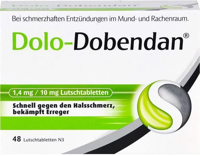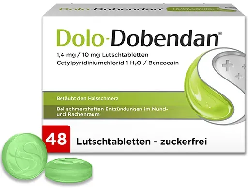 Reckitt Benckiser - Dolo-Dobendan Lutschtabletten bei Halsschmerzen, 48 St - bei claras-apotheke.de - aus Yadore Produktdaten ![]() ![]() RB Deutschland GmbH DOLO-DOBENDAN 1,4 mg/10 mg Lutschtabletten 48 St