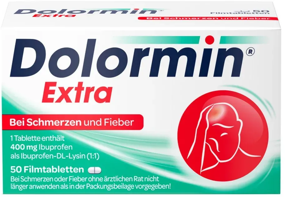 0,25 /St - Kategorie: Arzneimittel - kenvue - GTIN:4150024002293 - PZN:02400229 - Bei Fieber und SchmerzenSchneller Wirkeintritt meist schon nach 15 MinutenLanganhaltend mit einer Wirkdauer bis zu 8 StundenMit Ibuprofen-LysinBei leichten bis mäßig starken Schmerzen aller Art, z. B. Kopfschmerzen oder Zahnschmerzen und bei Fieber.Nach 15 Minuten beginnt oft bereits die Wirkung von DOLORMIN Extra, die bis zu 8 Stunden andauern kann.Das Arzneimittel enthält den gut verträglichen Wirkstoff Ibuprofen in Kombination mit dem körperverwandten Eiweißbaustein Lysin. So kann der Wirkstoff deutlich schneller vom Körper aufgenommen werden und in kurzer Zeit den Schmerz lindern. Hinweis: Bei Schmerzen oder Fieber ohne ärztlichen Rat nicht länger anwenden als in der Packungsbeilage vorgegeben!Pflichttext:Dolormin ExtraWirkstoff: Ibuprofen als Ibuprofen-DL-Lysin (1:1). Anwendungsgebiete: Symptomatische Kurzzeitbehandlung von leichten bis mäßig starken Schmerzen wie Kopfschmerzen, Zahnschmerzen, Regelschmerzen; Fieber. Für Kinder ab 20 kg Körpergewicht ( und älter), Jugendliche und Erwachsene. Warnhinweise: Bei Schmerzen oder Fieber ohne ärztlichen Rat nicht länger anwenden als in der Packungsbeilage vorgegeben!Zu Risiken und Nebenwirkungen lesen Sie die Packungsbeilage und fragen Sie Ihre ärztin, Ihren Arzt oder in Ihrer Apotheke.Johnson & Johnson GmbH, 41470 Neuss. Stand: 01/2024 - 12,33 Euro bei medpex.de - gefunden von billiger.de Die Shop Apotheke DE bietet Dolormin extra Filmtabletten 50 St für 12,53 Euro an, was ein attraktiver Preis ist. ![]() ![]() kenvue Dolormin extra Filmtabletten 50 St