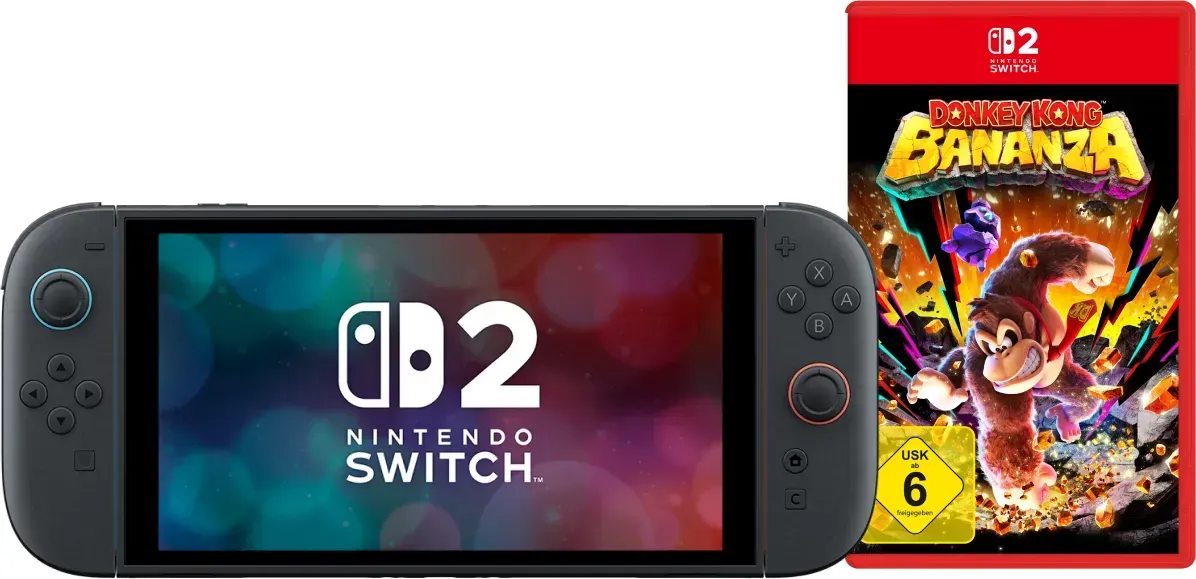 Verfügbarkeit: 1 Werktag - Kategorie: Konsolen - Nintendo - GTIN:6151124447425 - Renne, springe und boxe dich in Donkey Kong Bananza für die Nintendo Switch 2 durch tropische Wälder, Berge und Höhlen. Die mysteriöse Gruppe VoidCo hat alle Bananen gestohlen und nur du kannst sie wiederfinden. Die Nintendo Switch 2 ist eine verbesserte Nintendo Switch mit neuen Funktionen. Sie ist unter anderem größer als ihre Vorgängerin und hat verbesserte Joy-Cons. Das Design der Joy-Cons ist ergonomischer, weshalb sie besser in der Hand liegen. Außerdem spielst du deine alten Nintendo Switch Games auch auf der neuen Nintendo Switch, sodass du weiterhin Spaß an Mario Kart 8 Deluxe und Pokémon Karmesin oder Purpur hast. Mit der mitgelieferten Dockingstation schließt du die Switch 2 an deinen Fernseher an, um gemeinsam mit Freunden oder Familie die tollsten Partyspiele zu zocken. Musst du plötzlich los? Dann nimm die Switch aus der Dockingstation und spiele im Zug oder Auto einfach im Handheld-Modus weiter. Mit dem ausklappbaren Standfuß stellst du die Nintendo Switch 2 ganz einfach auf dem Tisch auf. Der Standfuß ist stabiler als der einer normalen Nintendo Switch. - 520,99 Euro bei coolblue - gefunden von billiger.de Dieses Konsolen-Set bietet ein hervorragendes Preis-Leistungs-Verhältnis, da es die Nintendo Switch 2 Konsole, Mario Kart World und Donkey Kong Bananza in einem Paket vereint. ![]() NINTENDO SWITCH 2 Konsolen-Set 'Switch 2 + Mario Kart World + Donkey Kong Bananza', schwarz, B:27,2cm H:16,6cm T:1,39cm, Spielekonsolen, Topseller