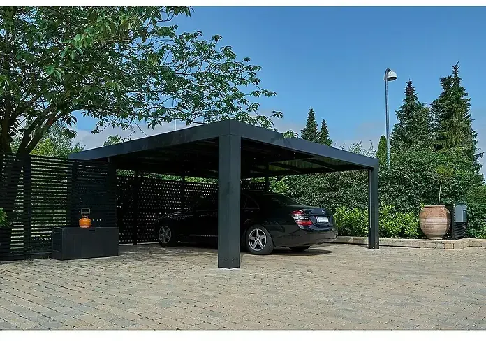 Kategorie: Carports - Abson - GTIN:5701148704175 - Der Abson Cubus Doppelcarport im eleganten Design bietet idealen Schutz für bis zu 2 Autos. Das feuerverzinkte Stahlgerüst ist besonders robust und die Dachplatten aus Polycarbonat erlauben eine natürliche Lichtdurchdringung. Der Doppelcarport kann beliebig mit Seitenwänden oder Endwänden ergänzt werden. Die Gesamthöhe beträgt 2,7 m, die lichte Höhe 2,4 m. 30 cm zur verdeckten Montage unter der Pflaster Oberkante. Achtung: bei zusätzlicher Montage der Anbauhäuser und Wänden muss die lichte Höhe von 2,4 m beachtet werden. - 11499,00 Euro bei BAUHAUS - gefunden von billiger.de Ein extragroßes Carport für bis zu drei Autos, ideal für Familien mit mehreren Fahrzeugen. ![]() ![]()