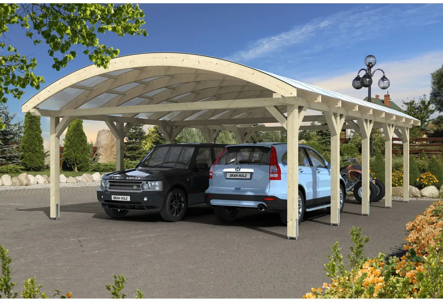 3 Händlerangebote bei billiger.de - Kategorie: Carports - SKANHOLZ - Das hochwertige Skanholz Bogendach Doppelcarport Franken aus Leimholz überzeugt durch seine hochwertige Qualität und wird durch das Runddach zum Blickfang auf Ihrem Grundstück. Größen: 635 x 541 cm, 635 x 755 cm, 635 x 969 cm Ausführungen: .. - GTIN:4018211042302 Das größte Carport in der Liste, geeignet für vier Autos, bietet maximalen Schutz und Platz. ![]() ![]()