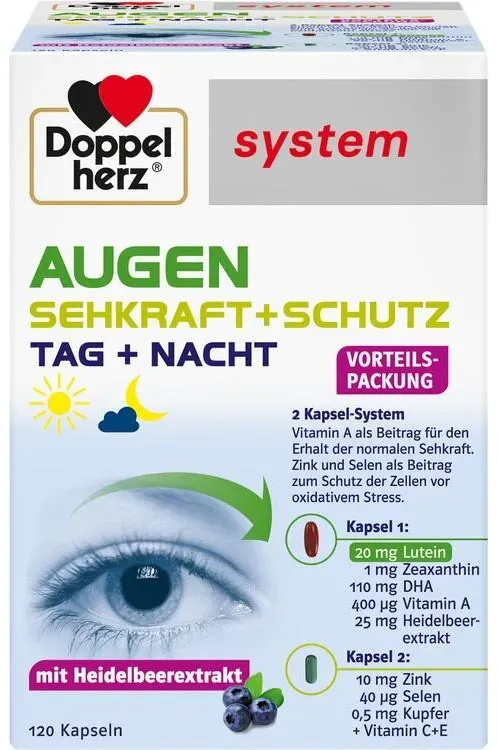 Gesundheitskategorien Nahrungsergänzungsmittel Vitamine Multivitamine Medizin & Heilmittel - EAN:4009932001426 - Anwendungsgebiet von Doppelherz system Augen Sehkraft + Schutz Tag und NachtDoppelherz system Augen Sehkraft + Schutz Tag und Nacht sind ein Nahrungsergänzungsmittel. Sie unterstützen den Zellstoffwechsel Ihrer Augen und leisten damit einen wichtigen Beitrag zur Augengesundheit. Das 2 Kapsel-System stellt dabei eine sinnvolle und einander ergänzende Kombination wichtiger Vital- und Mikronährstoffe dar, die speziell auf die Versorgung der Sehzellen und somit auf Ihre Sehfunktion und Sehschärfe abgestimmt ist.Wirkstoffe / Inhaltsstoffe / ZutatenDoppelherz system Augen Sehkraft + Schutz Tag und Nacht sind eine Kombipackung. Eine Tagesportion besteht aus zwei Kapseln unterschiedlicher Zusammensetzung: Zutaten Kapsel 1: SEEFISCHÖL, Gelatine (Rind), Feuchthaltemittel Glycerin, Distelöl, Emulgator Mono- und Diglyceride von Speisefettsäuren, Feuchthaltemittel Sorbit, Heidelbeerextrakt, lutein- und zeaxanthinhaltiges Konzentrat aus Studentenblumen, Stabilisator Bienenwachs gelb, Maisstärke, Farbstoff Eisenoxide und Eisenhydroxide, Riboflavin, Retinylpalmitat Zutaten Kapsel 2: L-Ascorbinsäure, SOJAÖL, Gelatine (Rind), Kokosöl, Feuchthaltemittel Glycerin, DL-alphaTocopherylacetat, Zinkoxid, Lecithine (SOJA), Feuchthaltemittel Sorbit, Emulgator Mono- und Diglyceride von Speisefettsäuren, Kupfersulfat, Farbstoff Eisenoxide und Eisenhydroxide, Natriumselenit, Farbstoff ... Dieses Angebot ist mit 21,47 Euro ein sehr preiswertes Standardprodukt. ![]() ![]() Doppelherz System Augen Sehkraft + Schutz Kapseln 120 St.
