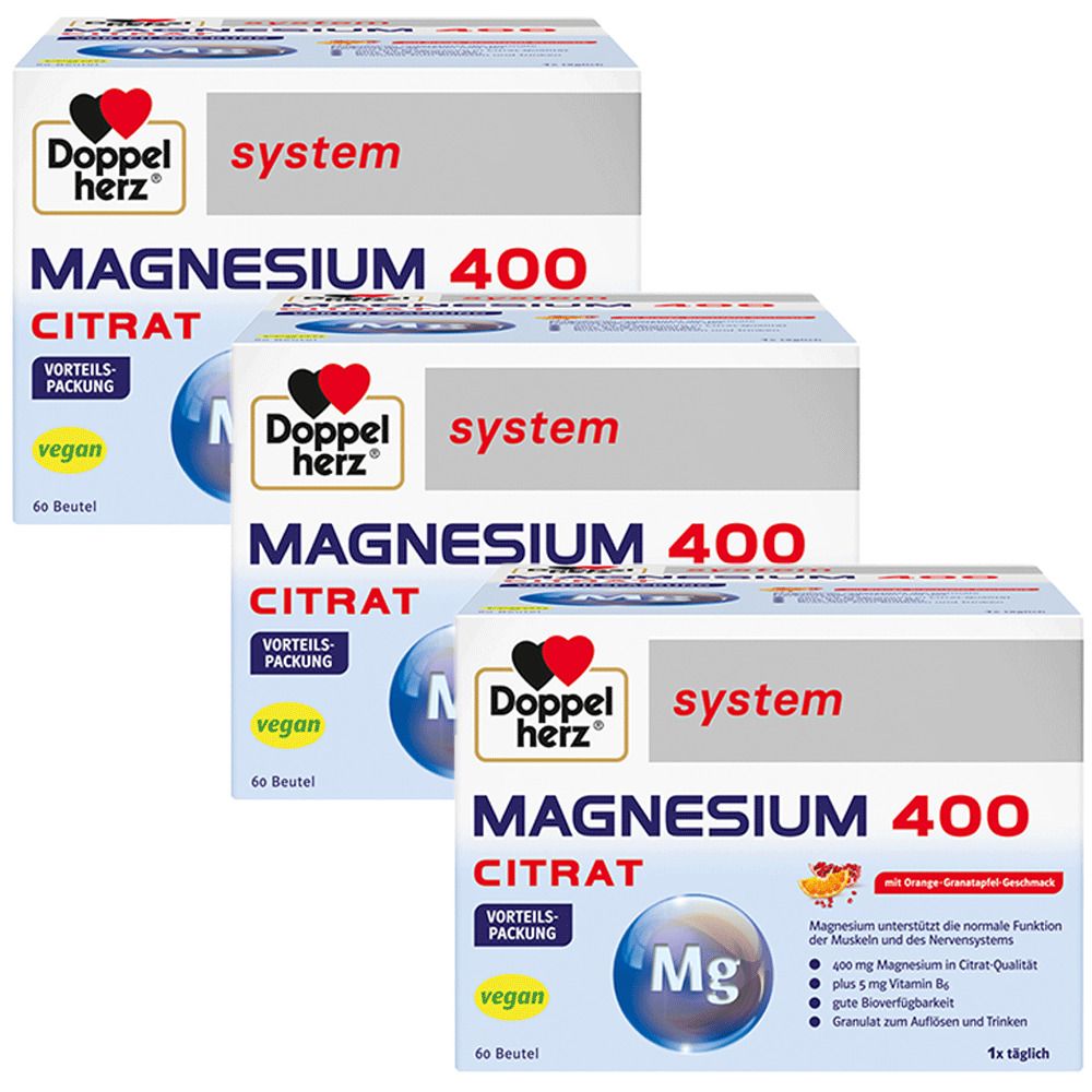 Doppelherz magnesium 400 citrat META PreisvergleichMit dem Meta-Preisvergleich suchen Sie gleichzeitig bei den großen Preisvergleich Portalen!Jetzt live Suche nach doppelherz magnesium 400 citrat starten! Doppelherz magnesium 400 citrat KaufberatungDoppelherz system Magnesium 400 Citrat ist ein beliebtes Nahrungsergänzungsmittel in Granulat-Form mit 400 mg Magnesiumcitrat, 5 mg Vitamin B6 und 27 mg Vitamin C pro Portionsbeutel (Orange-Granatapfel-Geschmack), das Muskel- und Nervenfunktion unterstützt.[1][2][3] Wichtige Hinweise vor dem Kauf und zur Einnahme