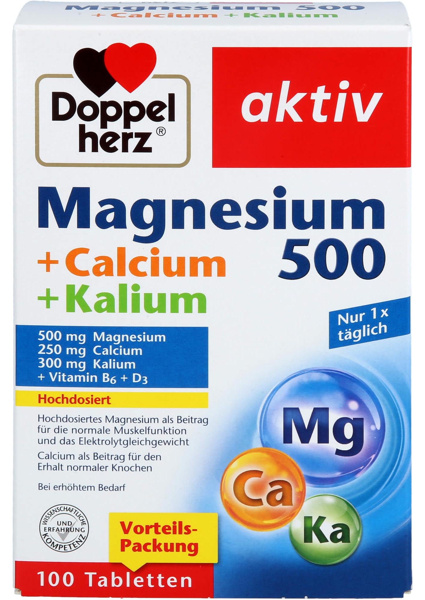 Doppelherz magnesium 500 calcium kalium 100 st META PreisvergleichMit dem Meta-Preisvergleich suchen Sie gleichzeitig bei den großen Preisvergleich Portalen!Jetzt live Suche nach doppelherz magnesium 500 calcium kalium 100 st starten! Doppelherz magnesium 500 calcium kalium 100 st KaufberatungDoppelherz Magnesium 500 + Calcium + Kalium Tabletten (100 St, PZN 18710541) ist ein Nahrungsergänzungsmittel mit hochdosiertem Magnesium, Calcium, Kalium sowie Vitamin D3 (20 ?g = 800 I.E.) und B6, das die Muskelfunktion, den Energiestoffwechsel, Nervensystem, Knochen und Blutdruck unterstützt.[2][3][4] Suchen Sie im Preisbereich von ca. 0,10-0,13 € pro Tablette (Gesamtpreis 10-13 € für 100 St), da dies der Standardpreis bei Apotheken-Shops ist.[5] Wichtige Hinweise vor dem Kauf und zur Einnahme