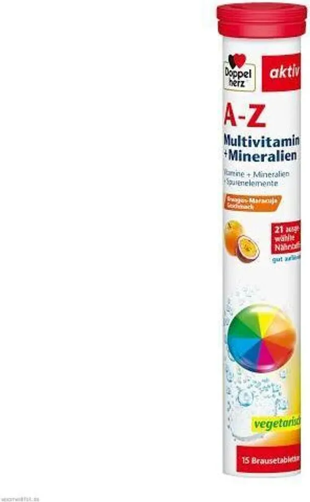 31 Händlerangebote bei billiger.de - Kategorie: Nahrungsergänzungsmittel - Doppelherz - Anwendungsgebiet von Doppelherz A-z Multivitamin+mineralien Brausetabletten (Packungsgröße: 15 stk)Die Doppelherz A-z Multivitamin+mineralien Brausetabletten (Packungsgröße: 15 stk) aus Ihrer Versandapotheke liefern viele lebensnotwendigen Vitaminen, Mineralstoffe und Spurenelemente, die absolut wichtig für Gesundheit und Wohlbefinden sind. Sie sind die Voraussetzung für jegliche Form der Leistungsfähigkeit. Schon 1 Brausetablette der Doppelherz A-z Multivitamin+mineralien Brausetabletten (Packungsgröße: 15 stk) versorgt Sie mit 21 wichtigen Nährstoffen - von Vitamin A bis zum Spurenelement Zink. Die Rundumversorgung ermöglicht ein gesünderes und vitaleres Leben. Da die Nährstoffe bei der Einnahme in flüssiger Form vorliegen, können sie besonders schnell vom Körper aufgenommen werden. Die Doppelherz A-z Multivitamin+mineralien Brausetabletten (Packungsgröße: 15 stk) erfrischen mit leckerem Blutorange-Maracuja-Geschmack.Wirkungsweise von Doppelherz A-z Multivitamin+mineralien Brausetabletten (Packungsgröße: 15 stk)Die Doppelherz A-z Multivitamin+mineralien Brausetabletten (Packungsgröße: 15 stk) enthalten sorgfältig aufeinander abgestimmte Vitamine, Mineralstoffe und Spurenelemente. Diese Vitalstoffe sind für den menschlichen Körper und dessen Stoffwechsel einfach unentbehrlich. Sie sind an praktisch allen Vorgängen im Körper beteiligt. Die Doppelherz A-z ... Dieses Angebot bietet A-Z Multivitamin+Mineralien Brausetabletten zu einem sehr attraktiven Preis von 2.43 Euro. ![]() ![]() Doppelherz A-Z Multivitamin+Mineralien Brausetabletten Inhalt: 93 g