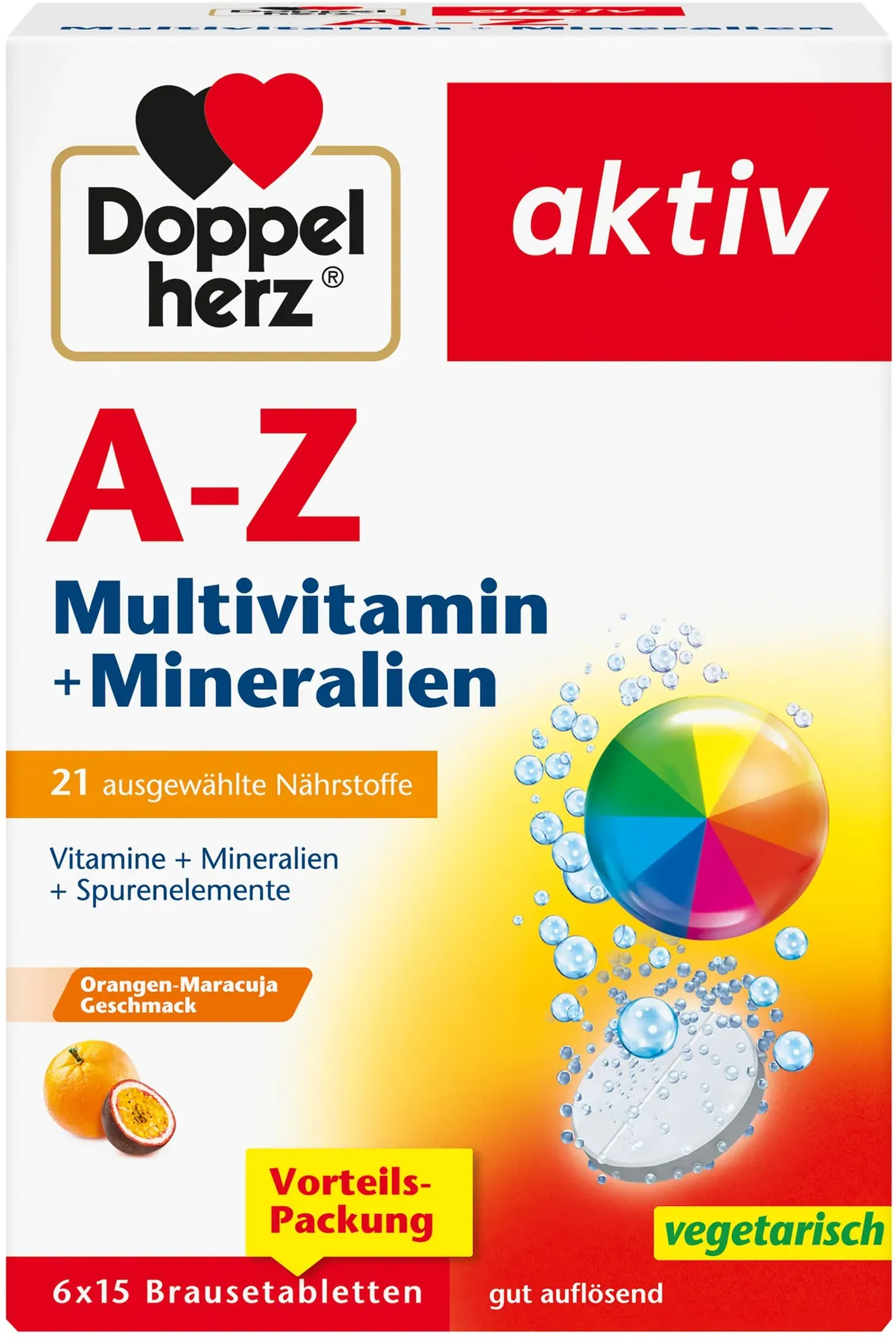 EAN: 4150064112181 - Zur Unterstützung der Gesundheit und des Wohlbefindens 21 wichtige Vitamine + Mineralien + Spurenelemente von A-Z Gut auflösende Brausetablette mit leckerem Orange-Maracuja-Geschmack Brausetabletten mit Vitaminen, Mineralstoffen und Spurenelementen Eine optimale Versorgung mit Vitaminen und Mineralstoffen ist eine wichtige Voraussetzung für das Wohlbefinden und die Leistungsfähigkeit unseres Körpers. Doppelherz aktiv A-Z Multivitamin + Mineralien Brausetabletten enthalten sorgfältig aufeinander abgestimmte Vitamine, Mineralstoffe und Spurenelemente. Diese Nährstoffe sind essentiell, d. h. unser Körper kann diese Stoffe nicht selbst bilden. Man muss sie regelmäßig und ausreichend über die Nahrung aufnehmen. Eine Nahrungsergänzung mit Doppelherz aktiv A-Z Multivitamin + Mineralien Brausetabletten empfiehlt sich bei unausgewogener Ernährung oder einem erhöhten Nährstoffbedarf; z. B. bei körperlicher Anstrengung (z. B. Sport) bei ungesunder Lebensweise (z. B. Tabak-/Alkoholgenuss) Schon 1 Brausetablette Doppelherz aktiv A-Z Multivitamin + Mineralien versorgt Sie mit 21 wichtigen Nährstoffen - von Vitamin A bis zum Spurenelement Zink - für Gesundheit und Wohlbefinden. - bei aponeo.de - aus Yadore Produktdaten Dieses Angebot ist mit 2.56 Euro das günstigste für A-Z Multivitamin+Mineralien Brausetabletten und somit ideal für preisbewusste Käufer. Juvalis.de Doppelherz A-z Multivitamin+mineralien Brausetabletten
