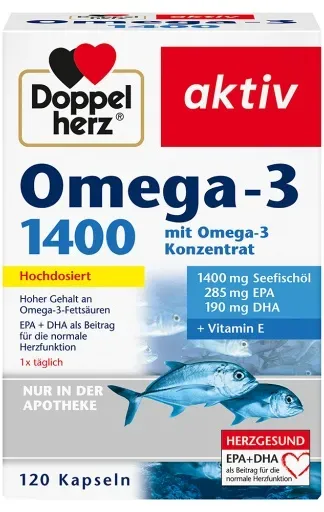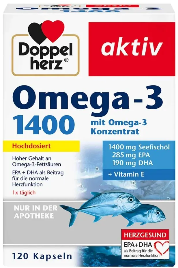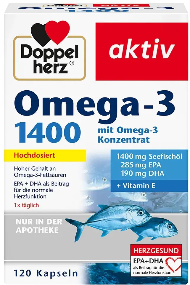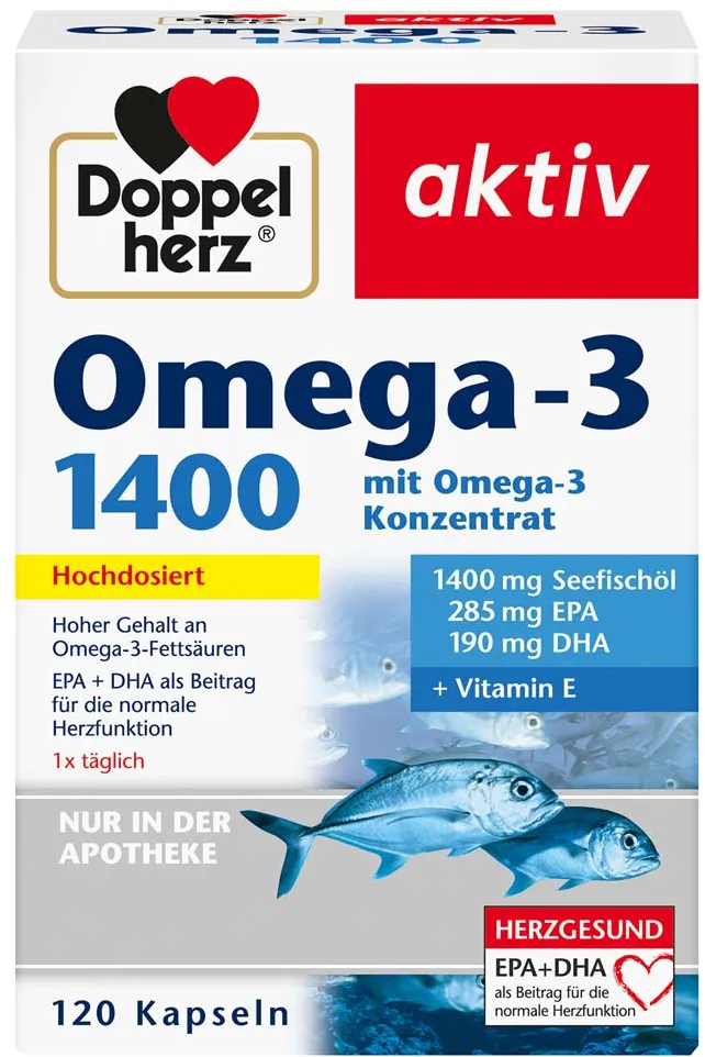 0,13 / 1 st - Kategorie: Nahrungsergänzungsmittel - Doppelherz - GTIN:4009932005455 - PZN:10532502 - Doppelherz Omega-3 1.400 Kapseln 120 St von Queisser Pharma GmbH & Co. KG günstig bei Ihrer Beraterapotheke bestellen - 15,27 Euro bei Beraterapotheke - gefunden von billiger.de Dieses Angebot von apotheke.de ist mit 15,59 Euro eine gute Wahl für 120 Kapseln. ![]() ![]() Doppelherz Omega-3 1.400 Kapseln