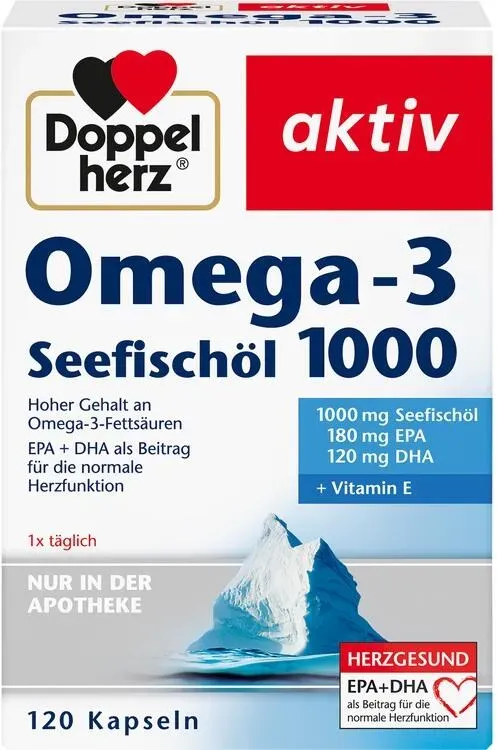 3.54 - Vitamine, Mineralien & Nahrungsergänzungsmittel Gesundes Herz Gesundheitskategorien Herz, Kreislauf & Diabetes Herz Vitamine & Ergänzungen - EAN:4009932006773 - Anwendungsgebiet von Doppelherz system Omega-3 family flüssigDas Nahrungsergänzungsmittel Doppelherz system Omega-3 family flüssig enthält wertvolle Omega-3-Fettsäuren in hoher Konzentration. Die Aufnahme von ungesättigten Fettsäuren über die Nahrung ist essentiell - bei einem Mangel kann es u.a. zu Herz und Kreislaufproblemen kommen. Weil Omega-3-Fettsäuren ein integraler Bestandteil der Membranen von Gehirn und Nerven sind, kann eine unzureichende Versorgung bei Kindern, Jugendlichen und Erwachsenen zu Konzentrations- und Lernschwächen führen. Mit Doppelherz system Omega-3 family flüssig kann ein Beitrag zur täglichen Versorgung mit wertvollen Omega-3-Fettsäuren geleistet werden. Doppelherz system Omega-3 family flüssig ist trinkfertig in flüssiger Form, schmeckt mit leckerem Fruchtgeschmack.Wirkstoffe / Inhaltsstoffe / ZutatenZutaten von Doppelherz system Omega-3 family flüssig: Wasser, Zucker, modifizierte Stärke, SEEFISCHÖL 3,2 %, Orangenpulver, Säuerungsmittel Milchsäure, Aroma, Verdickungsmittel Xanthan, Säureregulator Calciumlactat, Natrium-L-ascorbat, Konservierungsstoffe Kaliumsorbat und Natriumbenzoat, Nicotinamid, DL-alpha-Tocopherylacetat, Calcium-D-pantothenat, Pyridoxinhydrochlorid, Riboflavin, Thiaminhydrochlorid, Farbstoff Carotin, Retinylpalmitat, D-Biotin, Cholecalciferol, Cyanocobalamin ... Ein preisgünstiges Angebot für Seefischöl-Kapseln mit 1000 mg Omega-3, gut für den täglichen Bedarf. ![]() ![]() Doppelherz Aktiv Omega-3 Seefischöl 1000 Kapseln 120 St.