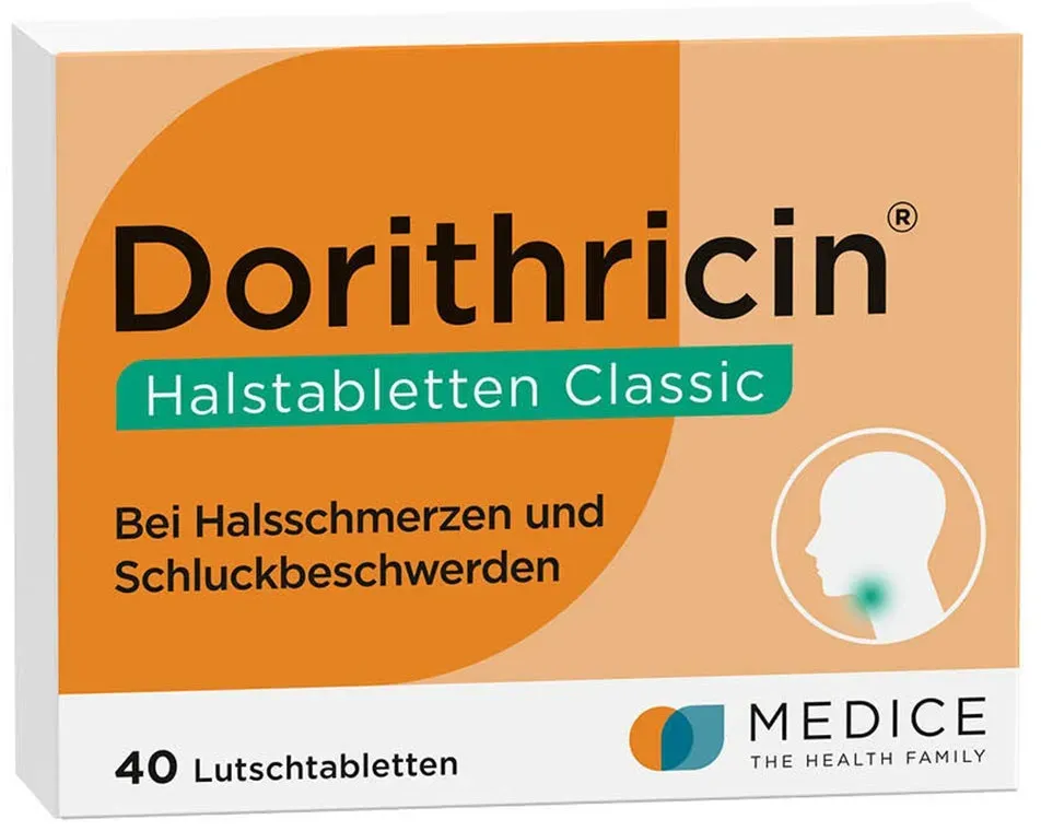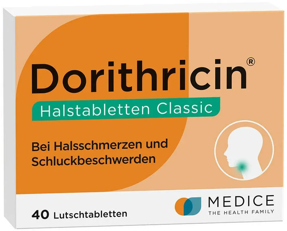 0.42 / 1 Stück - Kategorie: Arzneimittel - MEDICE - GTIN:4251595200542 - PZN:10078428 - Anwendungsgebiet: Zur symptomatischen Behandlung bei Infektionen des Mund- und Rachenraumes mit Halsschmerzen und Schluckbeschwerden. Enthält Sorbitol.MEDICE Arzneimittel, 58638 Iserlohn. ? Die Hals-Medizin für die ganze Familie: Bei Halsschmerzen und Schluckbeschwerden geeignet? Schnell gegen Halsschmerzen ? ohne unangenehm taubes Gefühl? Wirkt antibakteriell und antiviral? Mit leckerem Waldbeer-Geschmack ? extra für Kinder (auch zuckerfrei)Schnell. Wirkstark. Gut verträglich.Zur Behandlung von Halsschmerzen und Schluckbeschwerden hat sich Dorithricin seit Jahrzehnten ausgezeichnet bewährt. Es hilft schnell und effektiv zugleich. Mit der einzigartigen Wirkstoff-Formel lindert Dorithricin nicht nur schnell den Schmerz, sondern bekämpft auch gezielt Bakterien und Viren (Schmidbauer, M., 2015: Dorithricin wirkt antiviral (in vitro). Pharm. Ztg., 160. Jahrgang, 38. Ausg.: Seite 48?52) und bremst den Infekt, bevor die Halsschmerzen schlimmer werden. Dorithricin ? Schnell gegen Halsschmerzen? Antibakteriell? AntiviralDorithricin Halstabletten sind dabei ausgesprochen gut verträglich. Daher kann Dorithricin auch bei Kindern ab n angewendet werden, sobald sie kontrolliert lutschen können. Der leckere Waldbeer-Geschmack ist bei kleinen Halsschmerz-Patienten besonders beliebt. Gut zu wissen: Dorithricin ist frei von tierischen Bestandteilen, lactose-, gluten- und zuckerfrei.Einzigartige ... Dieses Doppelpack der Classic-Variante ist ideal für alle, die einen Vorrat anlegen möchten. Medikament e- per- klick.de