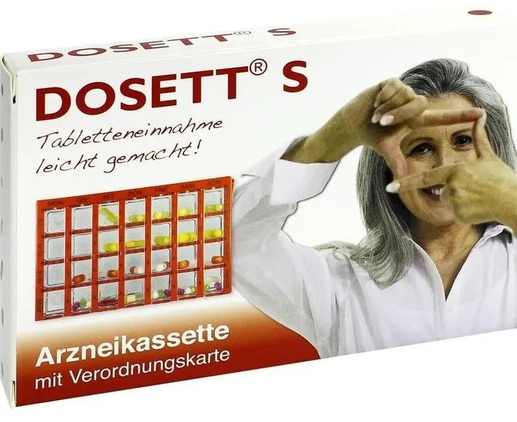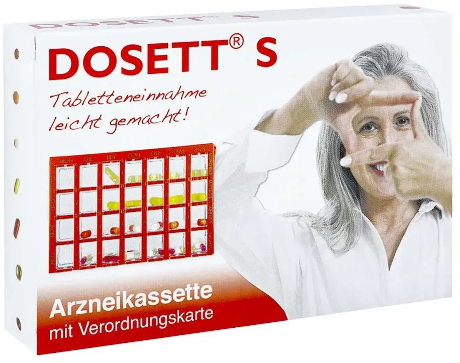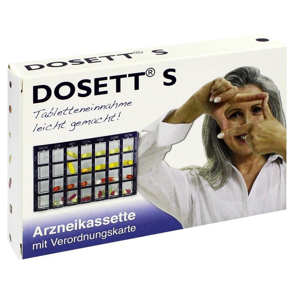 21 Händlerangebote bei billiger.de - Kategorie: Arzneimittel - Hormosan Pharma GmbH - Für die richtige Dosierung der Arzneimittel. Dosett ordnet Ihre Arzneimittel und sichert die richtige Einnahme zur richtigen Zeit! Sichert die Einnahme für 7 Tage. Sichert die richtige Dosierung. Sichert und fixiert die regelmäßige und zeitlich richtige Anwendung. Eine nützliche Serviceleistung liefern die Dosett 7 Tage Arzneikassetten: Besonders, wenn mehrere Medikamente zu unterschiedlichen Zeiten eingenommen werden müssen. Die farbigen Kästen gehen nicht so schnell verloren wie einzelne Tablettenschachteln, sind immer noch handlich genug für unterwegs. Maße: 15,5 x 10 x 2 cm. - GTIN:4150084846646 - PZN:08484664 Ein sehr preiswertes Angebot für die blaue Arzneikassette von einem bekannten Online-Apothekenanbieter. ![]() ![]() Dosett S Arzneikassette blau Inhalt: 1 St