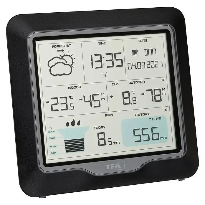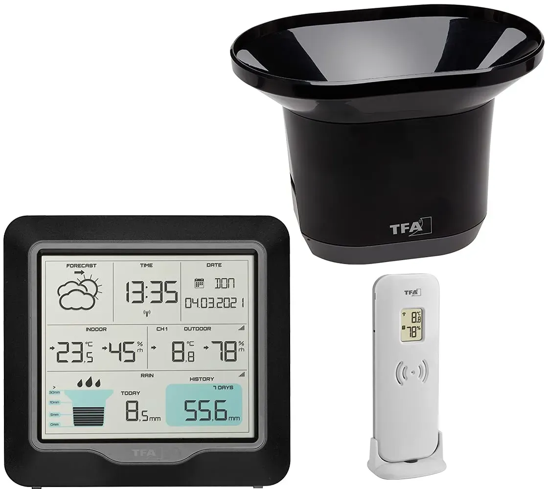 Auf Lager Versand durch AmazonTFA Dostmann RAIN Pro Wetterstation Funk, 35.1160.01, mit Regenmesser und Außensensor, Wettervorhersage, Innen-/ Außentemperatur, Luftfeuchtigkeit, einstellbare Alarmzustände, schwarz