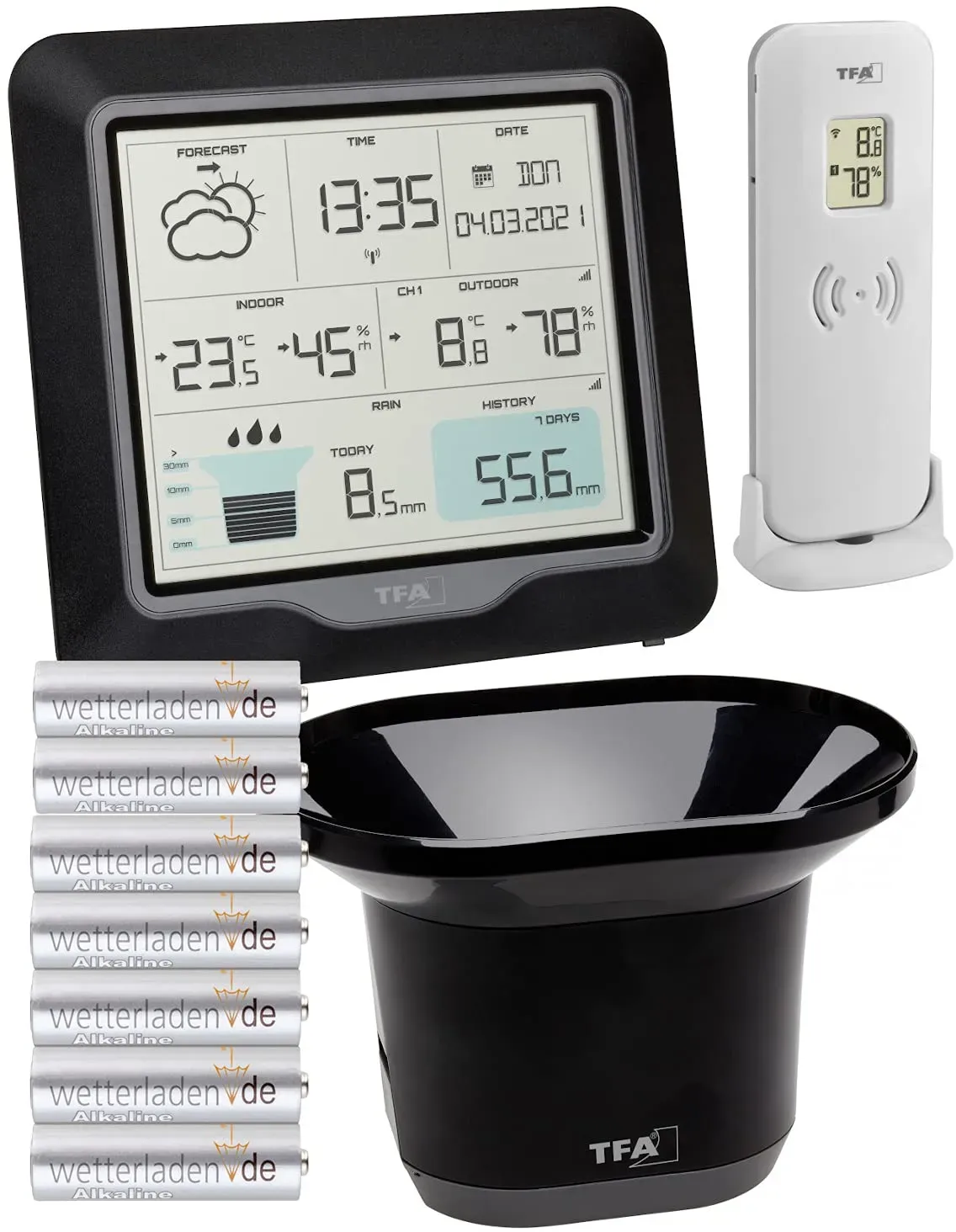 Zustand: Neu - Wetterstationen - TFA Dostmann - 35.1160.01 - EAN: 4009816038173 - 7 Stück langlebige wetterladen de 1,5 V AA Alkaline Batterien inklusive Wetterstation: Wetterstation Funk mit Wettervorhersage mit Wettersymbolen (sonnig, teilweise bewölkt, bedeckt, regnerisch, stürmisch) und Luftdrucktendenz, Wettervorhersage basiert auf Luftdruck und ist für einen Zeitraum von 12-24 Stunden Funkuhr: Digitale Funk-Wetterstation inkl Uhr mit Anzeige des aktuellen vollständigen Datums und Wochentag in 8 Sprachen (Deutsch, Englisch, Französisch, Italienisch, Niederländisch, Spanisch, Schwedisch und Tschechisch); Funkuhr ist abschaltbar oder kann mit Zeitzonenkorrektur korrigiert werden Regenmesser: Inklusive Funk-Regenmesser mit Anzeige der Regenmenge der letzten Stunde, der letzten 24 Stunden, der letzten 7 Tage, des aktuellen Monats, des laufenden Jahres und gesamt, mit monatlicher Historienfunktion und 24-Stunden-Regenalarm, aktuelle Regenmenge wird grafisch dargestellt Außensensor: Inklusive Thermo-Hygro-Sender für Außen zur Ermittlung der Außentemperatur und Luftfeuchtigkeit verwendbar oder auch in entfernten Räumen zur Klimaüberwachung im Keller, Garage oder Dachboden; Reichweite beträgt 100m, optional können bis 3 Sender (30.3249.02) angeschlossen werden Funktionen: Zur Raumklimakontrolle als Thermometer und zur Überwachung von Temperatur und Luftfeuchtigkeit, mit Trendpfeilen und Höchst- und Tiefstwerte mit Zeit und Datum der Speicherung, einstellbare Alarmzustände ... ![]() ![]() TFA 35.1160 - RAIN PRO eBay Funk-Wetterstation mit Regenmesser Wettervorhersage Funkuhr