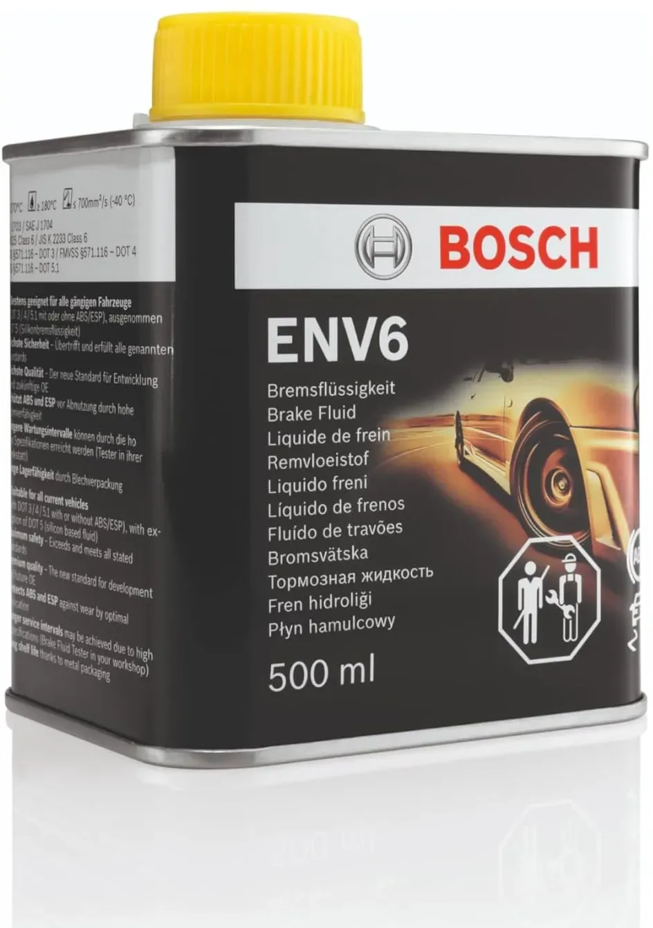 MOTUL - SignalwortAchtung GefahrenhinweiseH361d Kann vermutlich das Kind im Mutterleib schädigen. SicherheitshinweiseP101 Ist ärztlicher Rat erforderlich, Verpackung oder Kennzeichnungsetikett bereithalten. P102 Darf nicht in die Hände von Kindern gelangen.P202 Vor Gebrauch alle Sicherheitshinweise lesen und verstehen. P280 Schutzhandschuhe/ Schutzkleidung/ Augenschutz/ Gesichtsschutz/ Gehörschutz tragen.P308 + P313 BEI Exposition oder falls betroffen: ärztlichen Rat einholen/ärztliche Hilfe hinzuziehen.P405 Unter Verschluss aufbewahren.P501 Entsorgung des Inhalts/des Behälters gemäß den örtlichen Vorschriften - bei sip-scootershop.com - aus Yadore Produktdaten Bosch bietet hier eine 1L Bremsflüssigkeit für 12.51 Euro an, die OE-Qualität für moderne Bremssysteme verspricht. ![]() ![]() Bosch Bremsflüssigkeit ENV4, 1 L - für alle modernen Fahrzeuge mit ABS- und ESP-Bremssystemen - OE-Qualität - kompatibel mit DOT3, 4 und 4 (HP/LV)