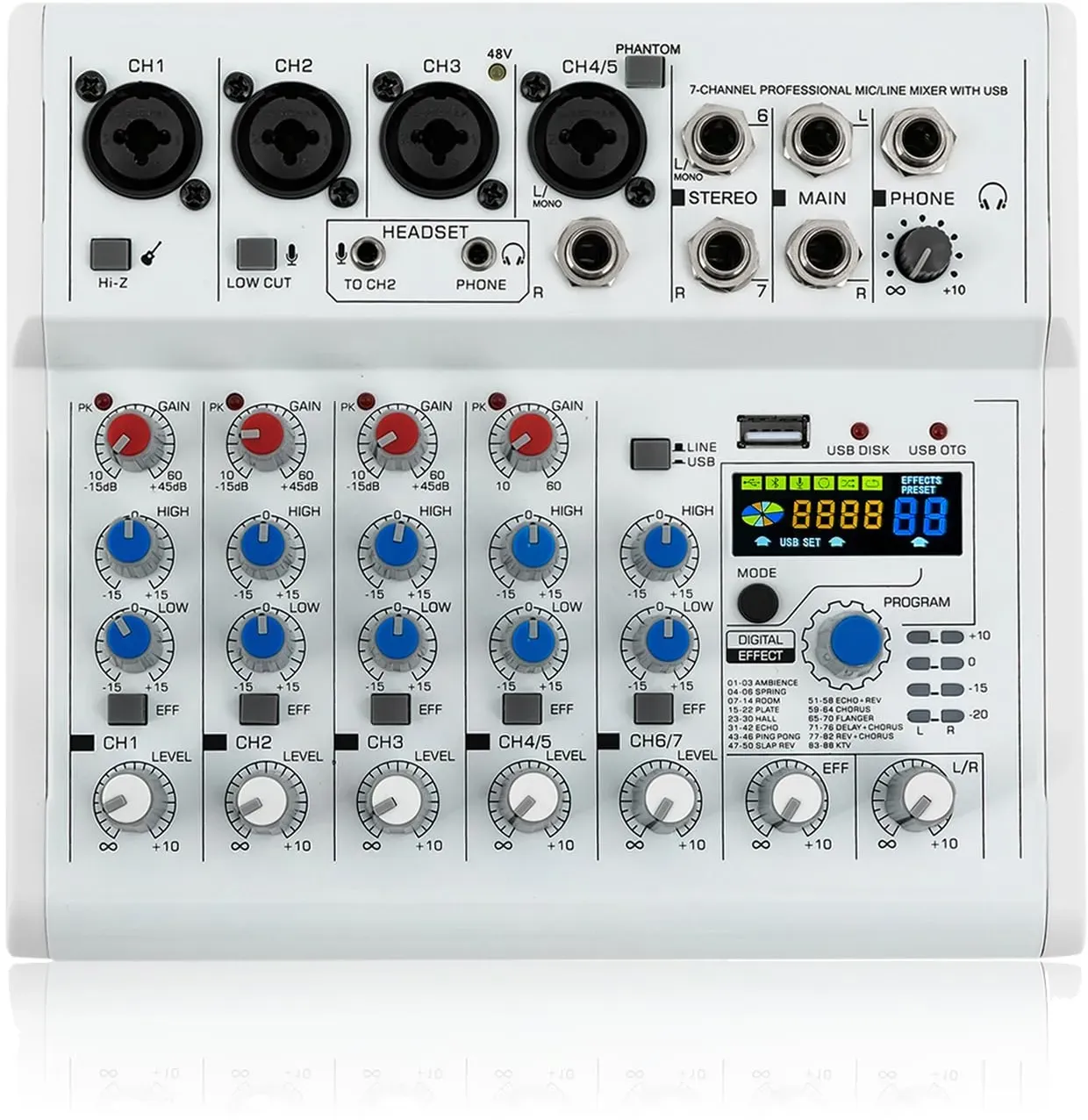 Dieses Angebot ist ein Beispiel für Angebote, die kürzlich auf dem eBay-Marktplatz in der Kategorie 42543 verfügbar waren. Bitte aktualisieren Sie die Suchergebnisse um aktuelle Angebote zu erhalten. ![]() ![]() 7-Kanal-Studio-Audio-Mixer, Stereo Sound Mischkonsole, Mischpult mit USB Bluetooth, Anzeige, 88 Arten von DPS Digitalen Effekten für Recording DJ Stage Karaoke Bars Aufnahmestudios, 48V Phantom Power(