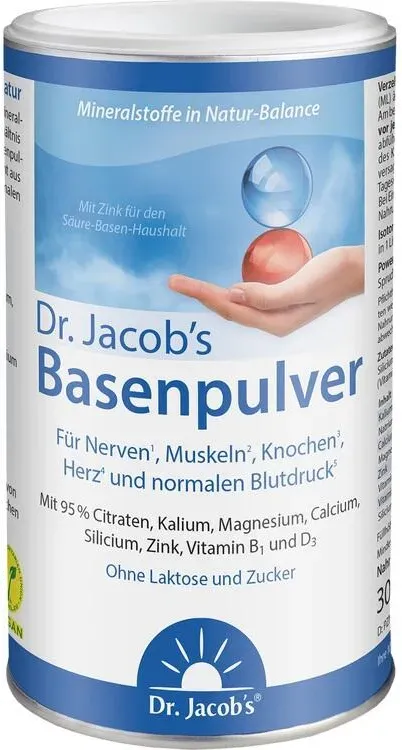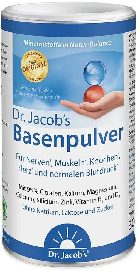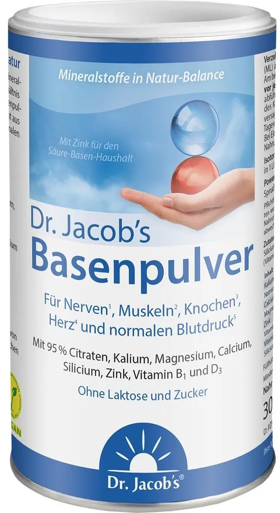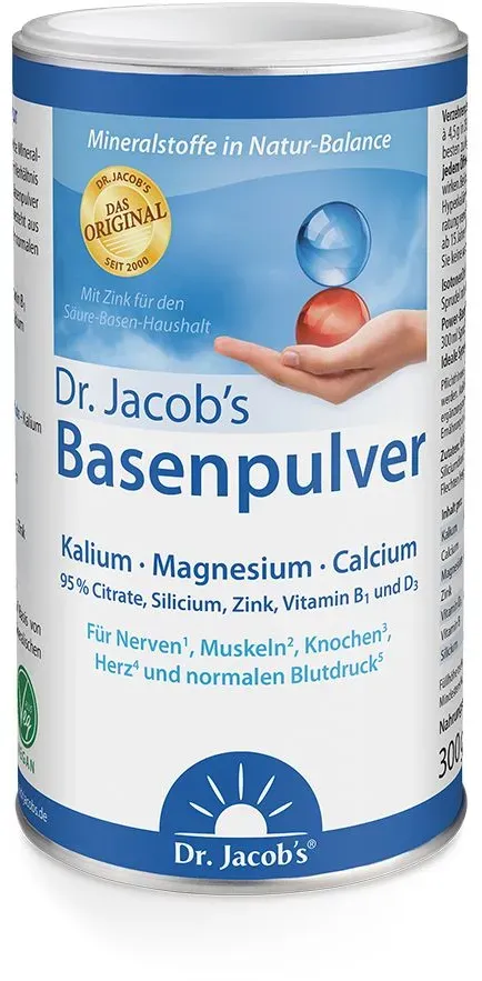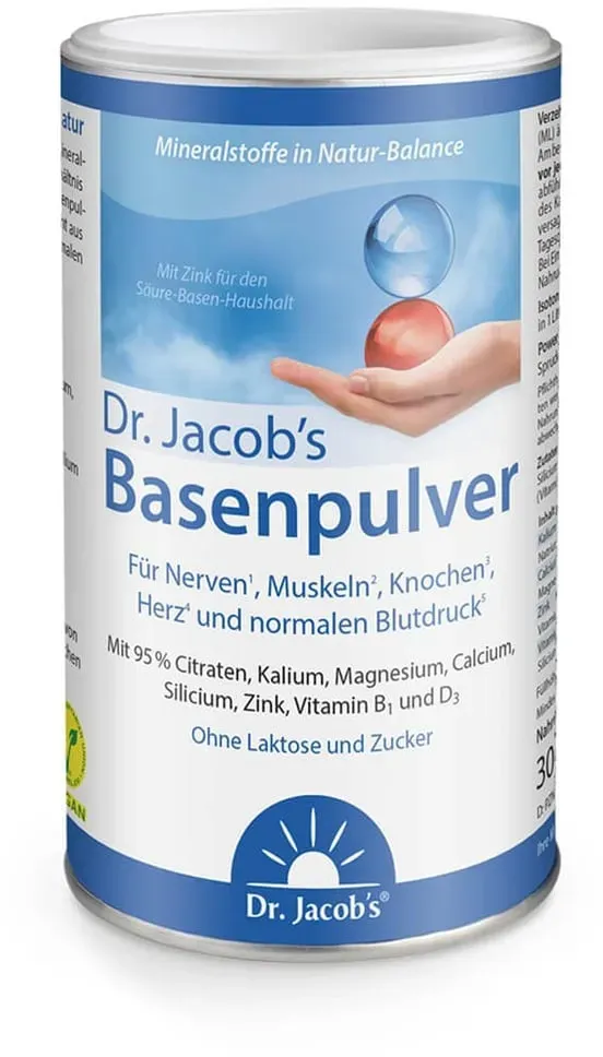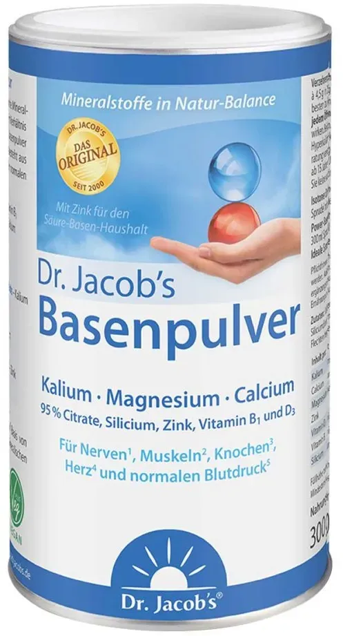 Zustand: Neu - 58,93 € / kg - Multimineralien Multimineral-Präparate - Dr. Jacob's Dr. Jacob's Medical GmbH - NBPLUS -03074878 - EAN: 0784216826677 EAN: 4150030748789 EAN: 4041246500219 - NACH DEM VORBILD DER NATUR: Dr. Jacob's Basenpulver plus - Mineralstoff-Balance auf Basis von Citraten & Laktat. Für Nerven, Muskeln, Knochen, weniger Müdigkeit sowie Herz und Blutdruck* DAS KALIUMREICHSTE BASENPULVER mit Magnesium und Calcium im Naturverhältnis (3:2). Kalium ist der wichtigste basische Mineralstoff in Obst und Gemüse und in allen Körperzellen. DEZENT GESÜßT mit Stevia-Extrakt, mit echter Zitrone verfeinert; schmeckt am besten mit Sprudel. Ideal als isotones Getränk für Sportler und als Diätbegleiter: ein Messlöffel pro Liter. HOCHKONZENTRIERT: 1 Portion entspricht dem Basengehalt von 800 g Gemüse und Obst (nach PRAL-Wert). 1 Dose = 50 Portionen. FREI VON ZUSATZSTOFFEN: Dr Jacob's Basen-Pulver plus ist frei von unnötigen Zusätzen: ohne Natrium, Füllstoffe, Aromen, Zucker, Laktose PREMIUM-QUALITÄT: Basenmittel-Expertise seit 2000 von der Apotheken-Marke Dr. Jacob€™s, Fertigung in Deutschland mit Citrat- und Laktat-Mineralstoffen aus der EU. - 23 Händler im amazon.de Marketplace ![]() claras- apotheke.d e Dr. Jacobs Basenpulver, 300 g