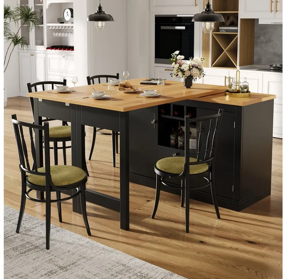 ![]() ![]() Flieks Kücheninsel mit 360 drehbarer und klappbarer Esstisch, (Holzoptik Tischplatte Tiefe 40-80cm, Längenverstellbar 120-180cm), ausziehbarer Esstisch & Mehrzweckschrank mit Schubladen und Weinregal schwarz
