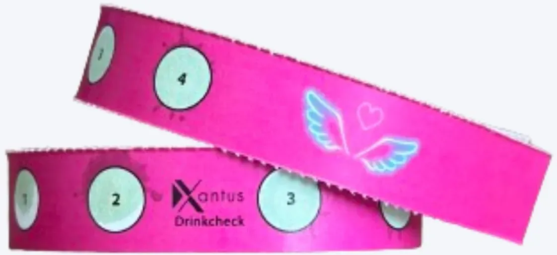 Gewöhnlich versandfertig in 3 bis 4 TagenXantus Drinkcheck Armband - Pink - 4 Testfelder - Dein Schutz vor KO Tropfen + Teste Dein Getränk + sicher feiern (2 Stück)