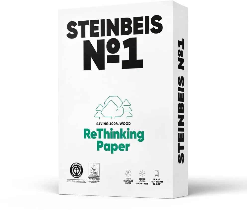 Kategorie: Papier - S.A.D. - GTIN:4250593403078 - Drucken mit Qualität: Unser hochwertiges Kopierpapier ist der ideale Begleiter für Ihren Büroalltag. Mit einer Weiße von CIE 161 liefert es besonders klare und professionelle Druckergebnisse perfekt für Geschäftskorrespondenz, Berichte oder interne Dokumente. Universell einsetzbar: Geeignet für alle gängigen Geräte wie Kopierer, Laser- und Tintenstrahldrucker, Faxgeräte und Multifunktionsgeräte für reibungsloses Drucken ohne Papierstau. Umweltfreundlich & zertifiziert: FSC Mix-zertifiziertes Papier aus nachhaltiger Forstwirtschaft, chlorfrei gebleicht und ausgezeichnet mit dem EU Ecolabel für umweltbewussten Bürobedarf. Optimale Grammatur: Mit 80 g/m2 bietet das Papier die perfekte Balance zwischen Stabilität und Flexibilität ideal für beidseitiges Drucken und eine angenehme Haptik. Großpackung mit 2500 Blatt: Fünf Packungen 500 Blatt ausreichend Vorrat für Büro, Homeoffice oder Schule. Spart Zeit und reduziert Verpackungsaufwand. - 22,78 Euro bei Amazon Marketplace Automotive - gefunden von billiger.de Ein weiteres Steinbeis Recycling-Papier, das eine gute Balance zwischen Preis und Umweltfreundlichkeit bietet. ![]() ![]() Steinbeis No. 1 Druckerpapier ? 2500 (5 x 500) Blatt DIN A4 Recycling-Papier 80 g/m², Weiß & Chlorfrei, hochwertiges Kopierpapier ISO 70 / CIE 55