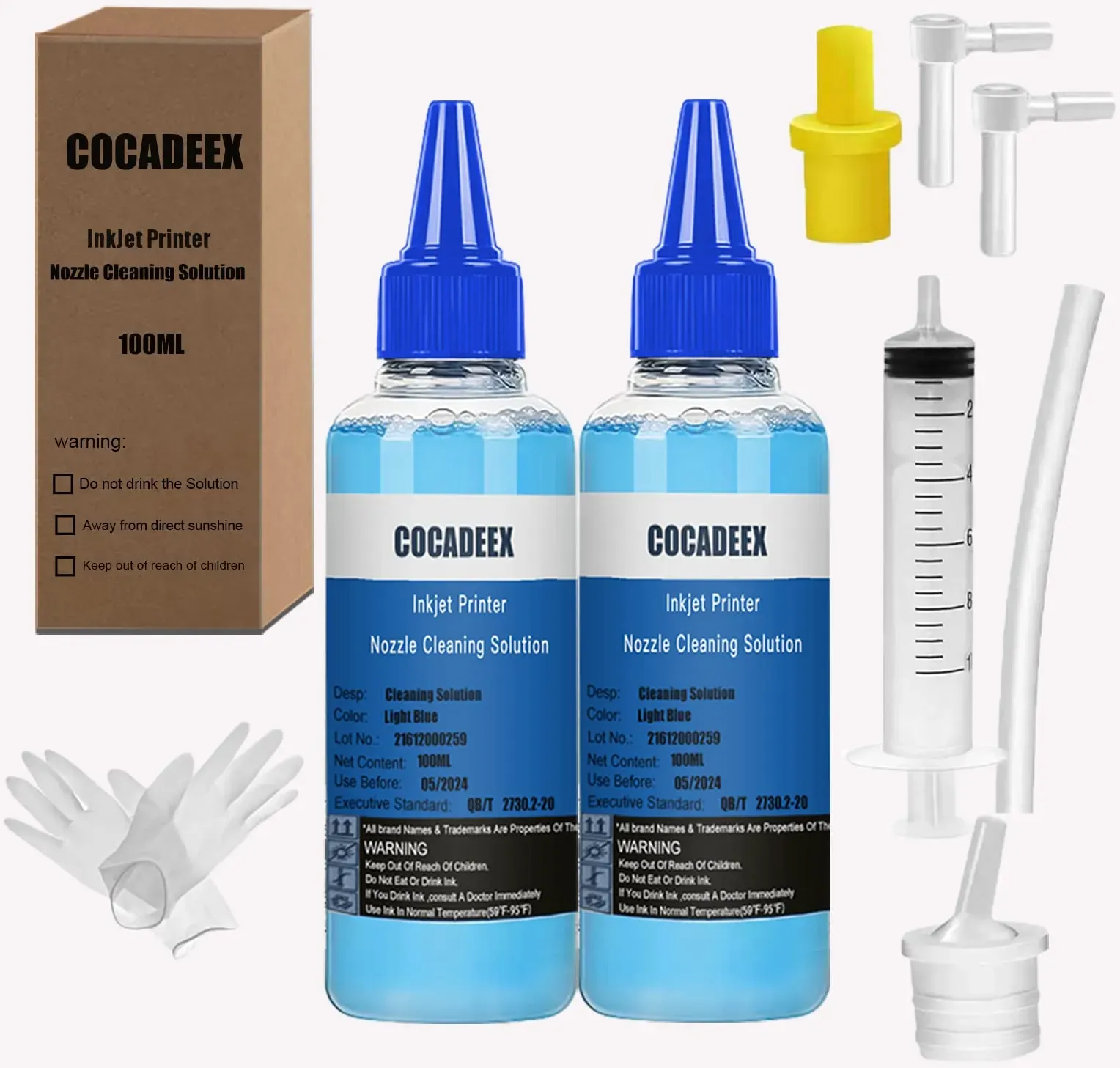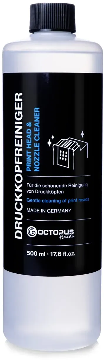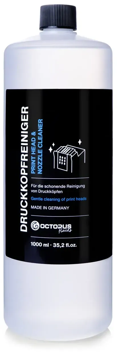 Verfügbarkeit: Auf Lager - Kategorie: Sonstiges Druckerzubehör - COCADEEX - a) Lieferumfang: 2 Flaschen 100 ml helles Cyanblau, 1 x 5 ml Spritze, 1 x Silikonschlauch, 1 x Paar Handschuhe, 2 x Ellenbogen, 1 x Düse großer Gummistopfen, 1 x Düse kleiner Gummistopfen, 1 x Bedienungsanleitung (evtl. nicht in deutscher Sprache). b) Hervorragende Leistung: Reinigungsflüssigkeit in Hellcyan, die Produktzusammensetzung ist viel näher an der Tinte. Leistungsstarke Inhaltsstoffe wie aktive Enzyme, starke Reinigung, umweltfreundlich. Beschädigt den Druckkopf nicht und reizt die Haut nicht. c ) Breite Kompatibilität: 1) Kompatibel mit Epson Stylus Serie, Workforce Serie, Expression Serie, Ecotank Serie Tintenstrahldrucker; 2) Kompatibel mit HP Deskjet Serie, Photosmart Serie, Officejet Serie, Envy Serie, Smart-Tank Serie Tintenstrahldrucker; 3) Kompatibel mit Canon Pixma Serie Drucker; 4) Kompatibel mit Brother / Lexmark Tintenstrahldrucker. d) Wird verwendet, um die Düsen des Druckkopfes zu lösen und die Druckqualität zu verbessern. (Vermeiden Sie schlechte Drucke, wie z. B. vertikale Streifen, horizontale Streifen, fehlende Farbe oder unvollständige Muster). e) rter Service: COCADEEX Druckkopf-Reinigungsset sind alle nach ISO9001, ISO14001, MSDS und RoHS zertifiziert. Die Druckkopf-Reinigungsflüssigkeit hat den strengen Standardtest bestanden. Wir akzeptieren 30 Tage kostenlose Rückgabe, wenn Sie mit unseren Produkten nicht zufrieden sind. - 14,98 Euro bei Amazon ... Für Vielnutzer ist dieser 1-Liter-Reiniger eine kostengünstige Lösung mit breiter Kompatibilität. ![]() ![]() Octopus Fluids Düsenreiniger, Druckkopfreiniger für Thermal- und Piezo- Druckköpfe, 1 Liter für Brother, Epson, HP, Canon, Kodak und Lexmark Drucker