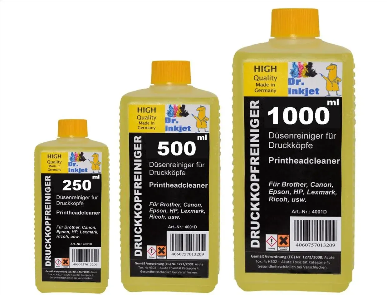 Verfügbarkeit: Auf Lager - Kategorie: Druckerpatronen - Dr. Inkjet - GTIN:4060757022638 - Lieferumfang je nach Auswahl: 4001C = 250ml Dr. Inkjet Düsenreiniger 4001D = 500ml Dr. Inkjet Düsenreiniger 4001E = 1000ml Dr. Inkjet Düsenreiniger Speziell für Sublimations- und DTF-Drucker entwickelt - Der Dr. Inkjet Druckkopfreiniger wurde speziell für die Anforderungen von Sublimations- und DTF-Druckern entwickelt. Seine einzigartige Formel ist perfekt auf diese Drucktechnologien abgestimmt, um Ablagerungen, Verstopfungen und Verschmutzungen effektiv zu entfernen, ohne die empfindlichen Druckköpfe zu beschädigen. Maximale Leistung und Langlebigkeit - Mit dem Dr. Inkjet Druckkopfreiniger können Sie sicherstellen, dass Ihre Druckköpfe stets in optimalem Zustand sind. Regelmäßige Reinigung mit unserem Reinigungsmittel trägt dazu bei, die Lebensdauer Ihrer Druckköpfe zu verlängern und die Konsistenz der Druckqualität auf höchstem Niveau zu halten. Einfache Anwendung - Die Anwendung des Dr. Inkjet Druckkopfreinigers ist denkbar einfach. Auf 'der Refiller' finden Sie alle nötigen Anweisungen wie unser Druckkopfreiniger einzusetzen ist. Sie müssen keine teuren Service-Techniker engagieren, um Ihre Druckköpfe zu warten. Mit unserem Druckkopfreiniger können Sie die Wartung ganz einfach selbst durchführen. Kosteneffizient - Im Vergleich zu anderen Druckkopfreinigern auf dem Markt ist der Dr. Inkjet Druckkopfreiniger äußerst kosteneffizient. Sie sparen nicht nur Geld ... Dieses 500ml Gebinde ist ideal für Nutzer, die regelmäßig eine größere Menge Reiniger für verschiedene Druckertypen benötigen. ![]() ![]() Octopus Fluids Düsenreiniger, Druckkopfreiniger für Thermal- und Piezo- Druckköpfe, 500ml für Brother, Epson, HP, Canon, Kodak und Lexmark Drucker