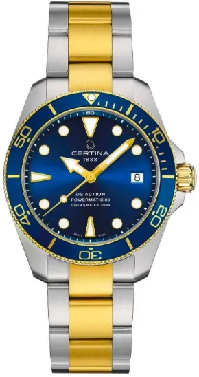 4 Händlerangebote bei billiger.de - Kategorie: Herrenuhren - Certina - Größe , onesize, Antrieb , Automatik, Anzeige , analog, Wasserdicht , bis 30 bar, Datumsfunktionen , Datum, Zifferblattfarbe , grün, Gehäusefarbe , silberfarben, Armbandfarbe , bicolorfarben, Herstellungsland , Swiss Made, Gehäusematerial , Edelstahl, Armbandmaterial , Edelstahl beschichtet, Gehäusedurchmesser (ohne Krone) , 38 mm, Gehäusehöhe , 12 mm, Stil , elegant, Gehäusebesonderheiten , Lünette einseitig drehbar, Krone verschraubt, Glas , Saphirglas, Verschluss Armband , Faltschließe mit Sicherheitsverschluss, - GTIN:7612307146522 Diese Variante mit blauem Zifferblatt ist eine klassische und vielseitige Option für Liebhaber von Taucheruhren. ![]() ![]() Certina DS Action Diver Edelstahl 38 mm C032.807.11.041.00