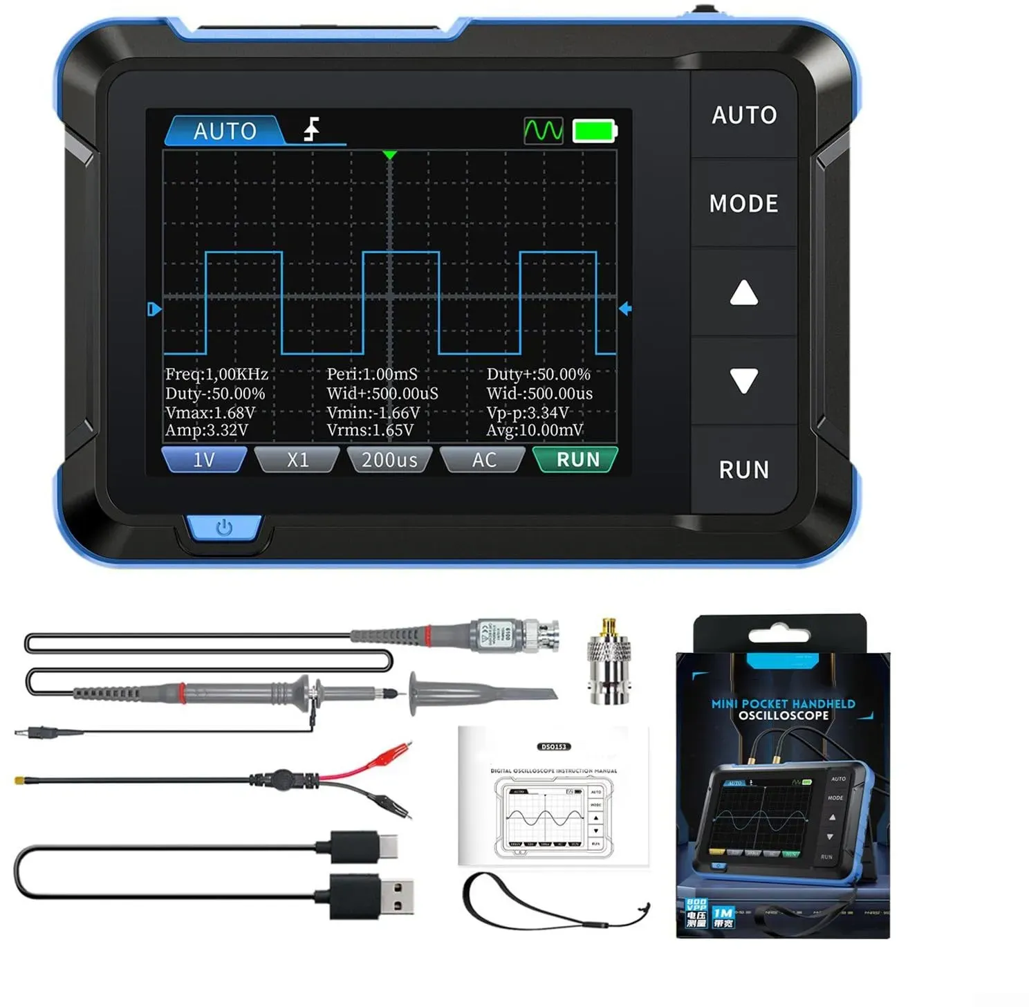Zustand: Neu - Oszilloskope Labor-Oszilloskope - AIOMEST - Digital Oscilloscope-DSO153-B - - 🎯2-in-1 Oszilloskop & Funktionsgenerator€‹€‹5 MS/s Abtastrate & 1 MHz Bandbreite für präzise Wellenformanalyse - misst Spannungen von €‹€‹±40V (X1) bis ±400V (X10)€‹€‹ mit €‹€‹10mV/Div-10V/Div Empfindlichkeit€‹€‹. Integrierter €‹€‹14-Wellenformen-Generator€‹€‹ (Sinus, Rechteck, Sägezahn, Rauschen etc.) mit €‹€‹0-10kHz Frequenzbereich€‹€‹ und €‹€‹0,1-3,3V Amplitude€‹€‹. Ideal für €‹€‹Kfz-Diagnose, Elektronikentwicklung und Ausbildung€‹€‹. 🎯Professionelle Trigger- & Messfunktionen€‹€‹Drei Trigger-Modi (€‹€‹Auto/Normal/Single€‹€‹) mit €‹€‹Flankenerkennung (steigend/fallend)€‹€‹ und €‹€‹AC/DC-Kopplung€‹€‹. €‹€‹500ns-20s Zeitbasis€‹€‹ erfasst schnelle Schaltvorgänge und langsame Signaländerungen. Kalibrierte Rechteckwelle (€‹€‹1kHz, 50% Tastverhältnis, 3,3V€‹€‹) zur Selbstdiagnose des Geräts.Drücken Sie lange die AUTO-Taste, um die Basislinie schnell zu kalibrieren, die Wellenform schnell zu messen und die Arbeitseffizienz zu verbessern. 🎯USB Rechargeable Oszilloskop€‹€‹Nur €‹€‹100g leicht€‹€‹ und €‹€‹99×68,3×19,5 mm klein€‹€‹ - passt in jede Werkzeugtasche. €‹€‹1000mAh Akku€‹€‹ ermöglicht €‹€‹4 Stunden Dauerbetrieb€‹€‹, USB-C-Schnellladung (5V/1A). Automatische Abschaltung (€‹€‹15/30/60 Min.€‹€‹) spart Energie. 🎯Bedienfreundliches Multilingual-Display€‹€‹2,8-Zoll-Display€‹€‹ (320×240 Pixel) mit einstellbarer Helligkeit und Tasten-Ton. €‹€‹8 Sprachauswahl€‹€‹ ... Für 56.79 Euro erhalten Sie ein 2-in-1 Digital-Speicher-Oszilloskop mit integriertem Funktionsgenerator, was es zu einem umfassenden Werkzeug macht. ![]() ![]() 2-in-1 DSO153 Digital-Speicher-Oszilloskop mit integriertem Funktionsgenerator, 1 MHz Bandbreite, 5 MS/s Abtastrate (B)