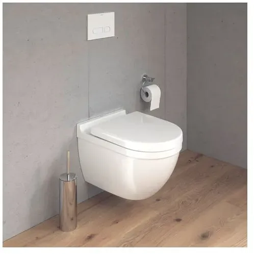 Kategorie: WCs - Duravit - GTIN:4021534223679 - Duravit Starck 3 Wand Tiefspül WC 2202090000 Artikelnr.: 2202090000 weiss Design by Philippe Starck Tiefspüler mit kurzer Ausladung aus Sanitärkeramik wandhängend für 4,5 Liter Spülwasser nach EN 997 mit Prüfzeugnis der LGA Würzburg außen glatte geschlossene rechteckige Beckenform vorne übergehend in einen Halbkreis Wandanschluss mit Aufkantung aus Hygienegründen mit geschlossenem Spülrand und keramischem Spülwasserverteiler Bodenfreiheit 55/25mm bei Einbauhöhe 400 mm Abmessungen (BxHxT) 360x485x320mm passenden WC-Sitz 0063810000 oder 0063890000 bitte mitbestellen - nicht im Lieferumfang enthalten - 241,07 Euro bei Obadis - gefunden von billiger.de Ein praktisches WC-Set inklusive WC-Sitz, das eine komplette Lösung für die Installation bietet. ![]() ![]() Duravit Starck 3 WC-Set wandh. Wand-WC, WC-Sitz, Weiß Hochglanz, Spülrand geschlossen, Abgang waagerecht, Spülmenge 4,5l 42000900A1