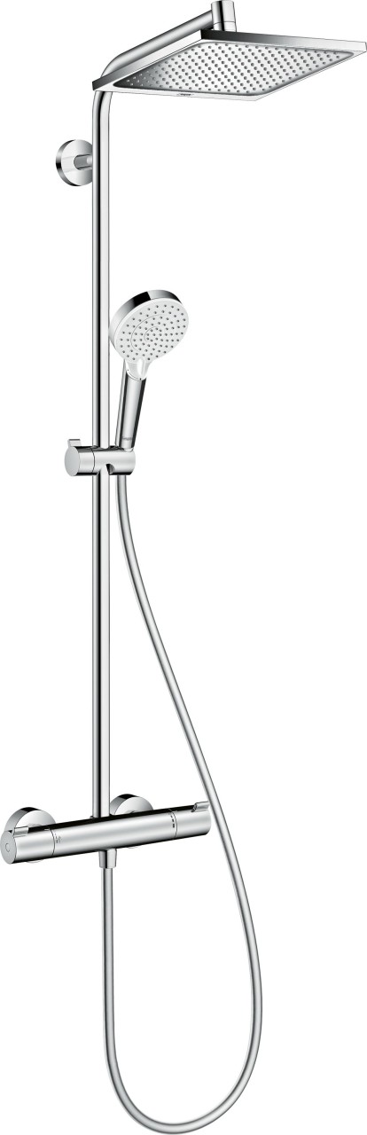 Auf Lager Versand durch Amazonhansgrohe Crometta E - Duschsystem mit Thermostat, Regendusche (240 x 240 mm) mit Armatur, Handbrause (2 Strahlarten), Schlauch, Brausestange und eckiger Kopfbrause (1 Strahlart), Chrom, 27271000