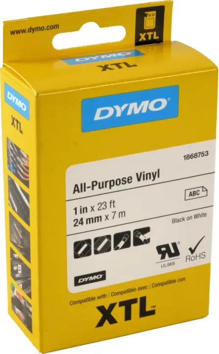 Etiketten Beschriftungsgeräte Bänder Papier & Etiketten - Ganz schön flexibel €” das DYMO Schriftband 1868753Dieses flexible, weiße Industrie-Beschriftungsband von DYMO eignet sich für nahezu jede Etikettier-Aufgabe. Setzen Sie das Schriftband in Ihren DYMO XTL 300/500 Etikettendrucker ein und legen Sie los. Erstellen Sie Ihre Industrie-Etiketten damit schnell und sauber. Das Vinyl-Schriftband ist sowohl für drinnen als auch für draußen geeignet. Denn Vinyl ist ein widerstandsfähiger Kunststoff, dem selbst Wasser, UV-Licht, Chemikalien und extreme Temperaturen nichts anhaben können. Das flexible DYMO Schriftband 1868753 passt sich an alle Oberflächen bestens an. Durch den schwarzen Druck auf weißem Band ist das Band zudem auffallend und vielseitig einsetzbar.Bestellen Sie das DYMO 1868753 für Ihren DYMO XTL 300/500 online bei uns im Shop und freuen Sie sich über unsere guten Preise und die schnelle Lieferzeit. - gefunden von Kelkoo Dieses Angebot ist eine gute Wahl für ein Dymo XTL Allzweck-Vinyletikett in Schwarz auf Weiß von einem vertrauenswürdigen Händler. ![]() ![]() DYMO XTL Allzweck-Vinyletikett | 24 mm x 7 m | Schwarz auf Weiß