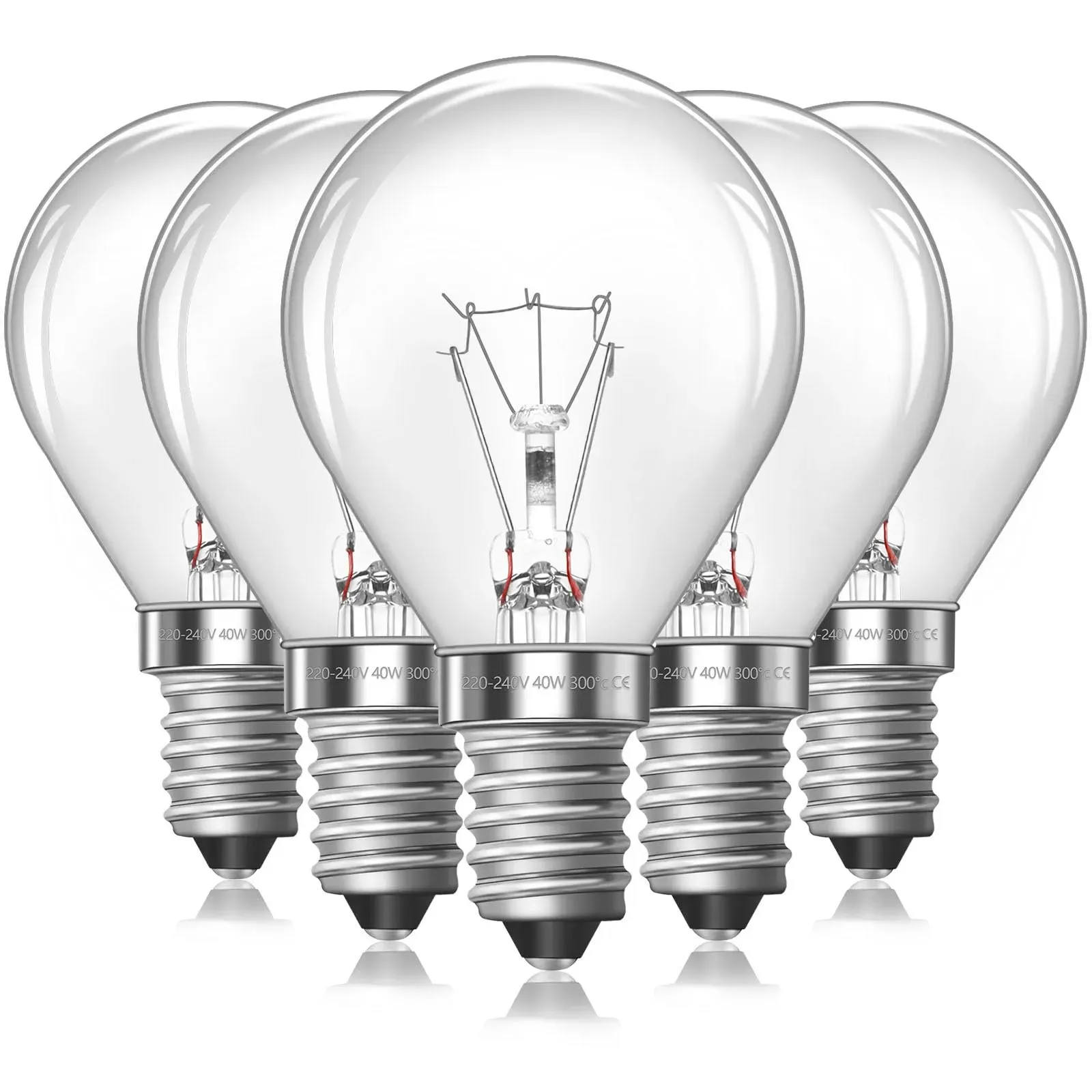 Auf Lager Versand durch Amazon5er Pack E14 40 watt Oven Bulb, SES E14 Globe Glühbirne, 45 mm x 78 mm, G45 Glühbirne Warmweiß 2700K, Dimmbar, 300°C, 230V, glühbirne e14 Golfball für Mikrowelle, Backofen