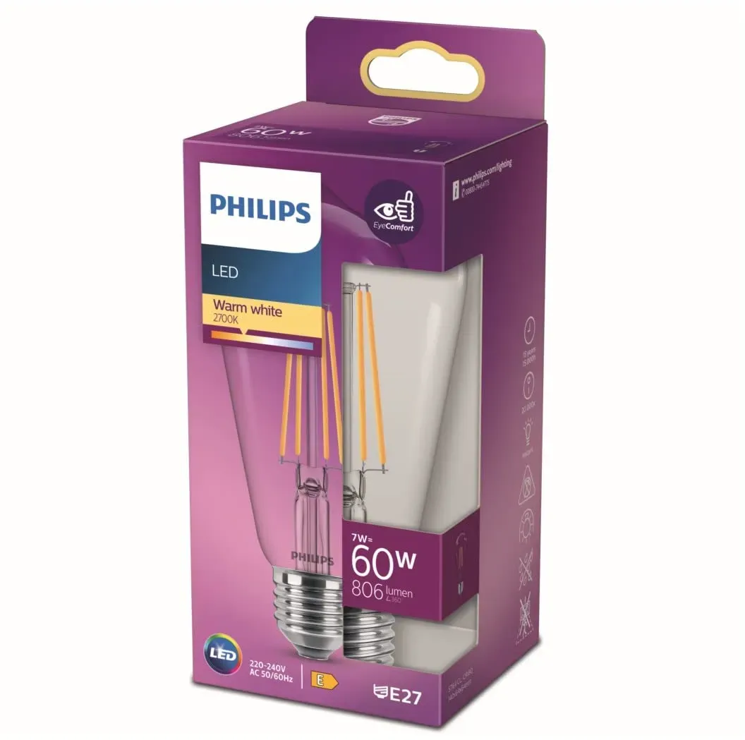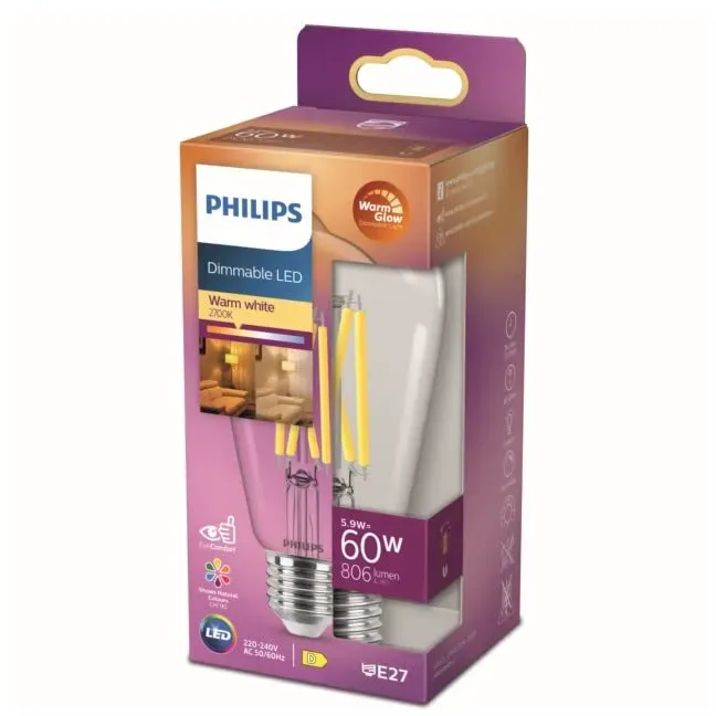 Zustand: Neu - LED Lampen - Philips Lighting Signify - LEDFILSF60E27P 929002029055 - EAN: 8718699762315 - Philips LED Classic: Genießen Sie warmweißes Licht (2.700 K) wie bei herkömmlichen Glühlampen/ Halogenlampen Hochwertiges Design: Durch klare Filament-Optik ideal für Leuchten mit sichtbarem Leuchtmittel geeignet Geringer Energieverbrauch: Bis zu 90% Energieeinsparung im Vergleich zu herkæžšmmlichen Leuchtmitteln Produkt mit EyeComfort Siegel: Philips LED-Lampen bieten komfortables Licht, das Ihre Augen schont Modernste LED Technik: Extrem lange Lebensdauer von bis zu 1 n - 18 Händler im amazon.de Marketplace ![]() ![]() Philips LED Classic E27 Lampe, 60 W, Tropfenform, A60, klar, warmweiß