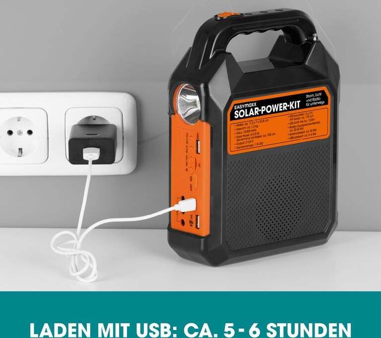 EAN: 4052926094676 - Zum Aufladen von Handy und anderen elektrischen GerätenInklusive integriertem FM-Radio und LautsprecherMit Taschenlampe und 3 mobilen LED-Leuchten2 Auflademodi: Solarpanel oder USBStrom, Licht und Radio jederzeit dabei Mit dem praktischen Solar-Power-Kit von EASYmaxx sind Sie immer und überall bestens ausgestattet - denn Sie haben Lampen, Radio, Lautsprecher und Powerbank gleichzeitig in einem Gerät jederzeit griffbereit. Ob beim Wandern, Biken, bei einer Autopanne oder daheim im Garten: Wenn Ihr Handy-Akku leer ist, laden Sie ihn einfach auf. Wenn es dunkel wird, können Sie sowohl die Taschenlampe als auch drei weitere mobile LED-Leuchten nutzen, um die Umgebung auszuleuchten. Dabei lässt sich auf Wunsch entweder Radio hören oder über den Lautsprecher Ihre eigene Playlist vom Handy abspielen. Eine Akkuladung reicht für ca. 12 Stunden Licht oder bis zu 36 Stunden Radio/Musik. Anschließend können Sie den Akku des Solar-Power-Kits von EASYmaxx entweder per USB oder - dank eigenem Solarpanel - über Sonnenstrahlen wieder aufladen. Perfekt für alle Freizeitaktivitäten oder bei Stromausfall. - bei kaufland.de - aus Yadore Produktdaten ![]() ![]() EASYmaxx Solar-Generator Kit 4500mAh