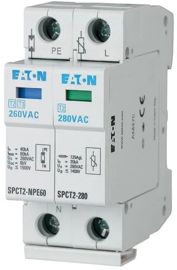 Kategorie: Sonstige Elektroinstallationsartikel - Eaton Power Quality - GTIN:4015081641109 - Geliefert wird: Eaton überspannungsableiter SPCT2-335-1+NPE, Verpackungseinheit: 1 Stück, EAN: 4015081641109. - 55,51 Euro bei elektro4000.de - gefunden von billiger.de Ein kostengünstiger Überspannungsschutz-Ableiter für Verteilerschränke mit 20 kA, ideal für den Basisschutz. ![]() ![]() Eaton Power Quality Eaton 167592 SPCT2-280 überspannungsschutz-Ableiter überspannungsschutz für: Verteilerschrank 20 kA 1St.