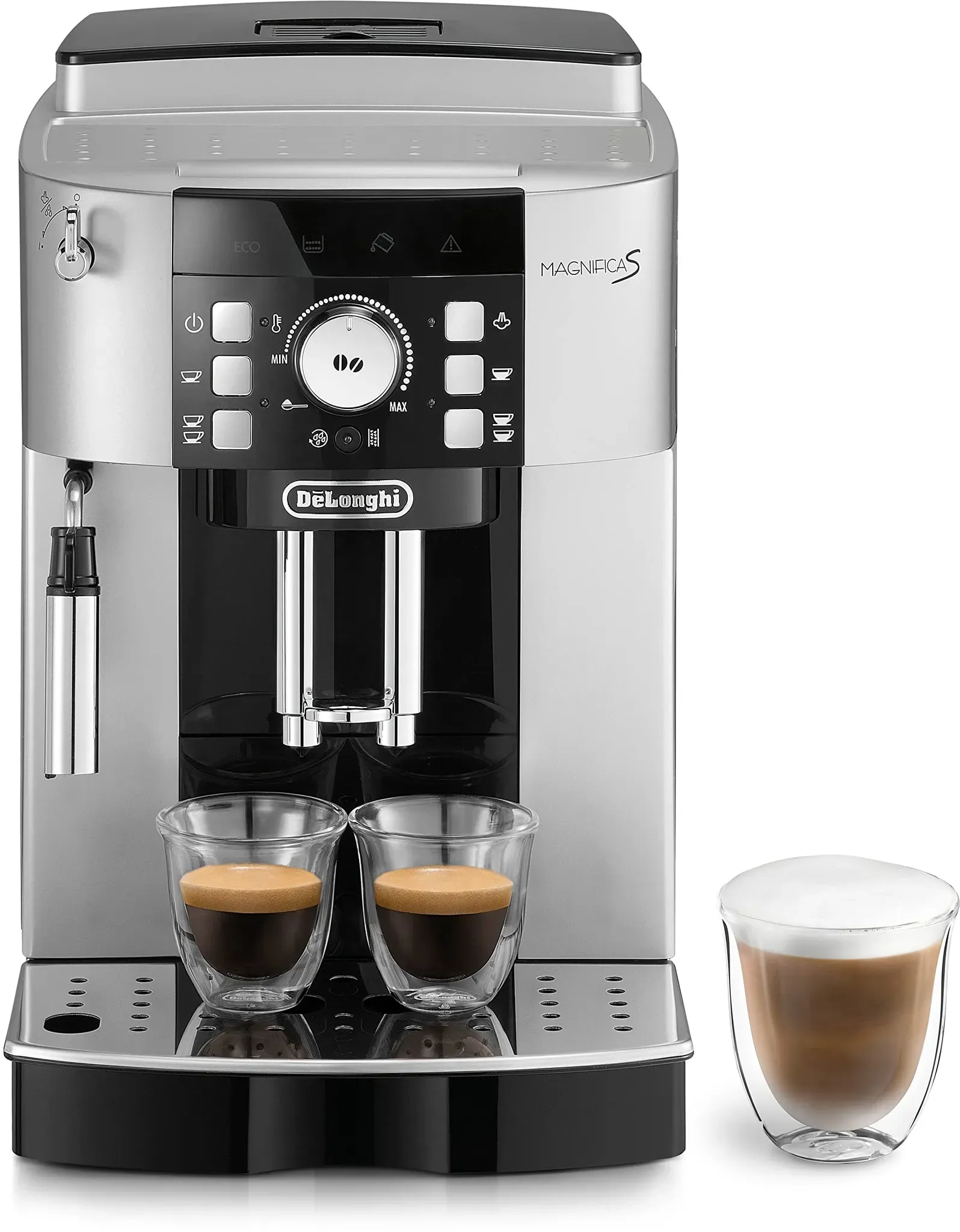 3 Händlerangebote bei billiger.de - Kategorie: Kaffeevollautomaten - De'Longhi - DeLonghi Kaffeevollautomat in der Farbe weiss Vorbrüh-Aroma-System für perfekten Kaffee Flüster-Kegelmahlwerk herausnehmbare Brühgruppe für einfache Reinigung Cappuccino-Aufschäumdüse - GTIN:8004399327979 Für diejenigen, die eine silber/schwarze Variante bevorzugen, bietet billiger.de hier ein gutes Preis-Leistungs-Verhältnis. ![]() ![]() De'Longhi Magnifica S ECAM 21.117 SB silber/schwarz