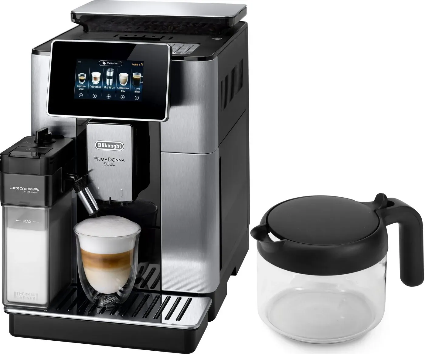 Verfügbarkeit: 2-3 Werktage - Kategorie: Kaffeevollautomaten - De'Longhi - GTIN:8004399334885 - Bestseller. Wählen Sie aus einer Vielzahl an Getränken Ihren Favoriten und bereiten Sie ihn ganz nach Ihrem Geschmack zu. über die Direktwahltasten auf dem Touch-Display wählen Sie Espresso, Long Coffee, Doppio+, Cappuccino, Latte Macchiato oder heiße Milch. Zusätzlich bietet die Funktion Mein Kaffee viele individuelle Einstellungen, die ebenso in der Coffee Link App vorgenommen werden können. Zusätzlich bietet die Bean Adapt Technologie über die App die Möglichkeit, die optimalen Einstellungen für die gewählte Bohnensorte automatisch einzustellen. Fünf Kaffeestärken bieten Kaffee von sehr mild bis sehr kräftig. Das Modell erlaubt bis zu fünf Benutzerprofile. Zudem verfügt die Maschine über ein Kaffeepulver-Fach, mit dem Sie beispielsweise koffeinfreien Kaffee zubereiten können. Ihre Pflege ist kinderleicht. Die wartungsarme Brühgruppe lässt sich leicht herausnehmen und die abnehmbare Abtropfschale mit Wasserstandsanzeiger ist spülmaschinengeeignet., Allgemein: Weitere Vorteile: €¢ VIELFALT UND PERFEKTER MILCHSCHAUM: Eine große Auswahl Kaffee- und Milchspezialitäten auf Knopfdruck: Espresso, Kaffee, Long Coffee, Cappuccino, Latte Macchiatto, heiße Milch uvm. Dank dem patentierten LatteCrema Milchaufschäumsystem erhalten Sie Ihre Milch-Kaffee-Spezialität in der optimalen Konsistenz mit einem besonders cremigen, feinporigen Milchschaum., EINFACHE ... ![]() ![]() De'Longhi Kaffeevollautomat PrimaDonna Soul ECAM610.75.MB - Mit Kaffeekannen-Funktion, Inkl. Kaffeekanne, Bean Adapt Technology, Edelstahl, Scheibenmahlwerk silberfarben