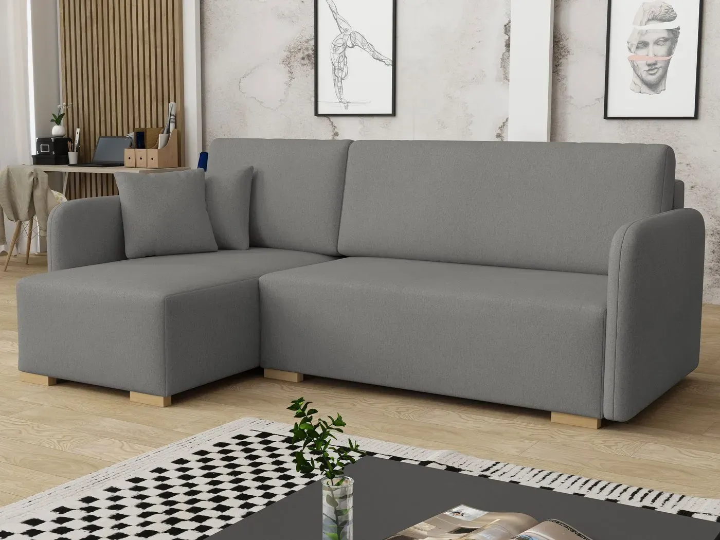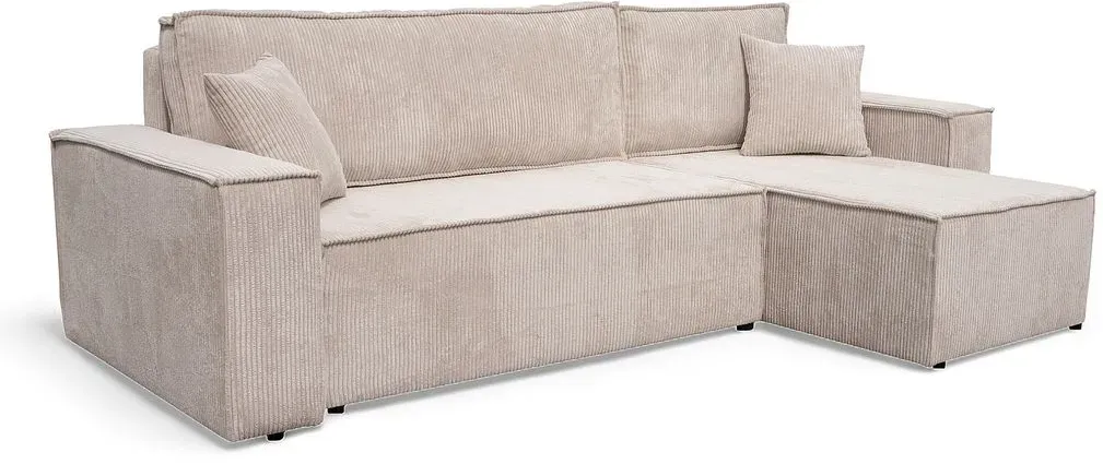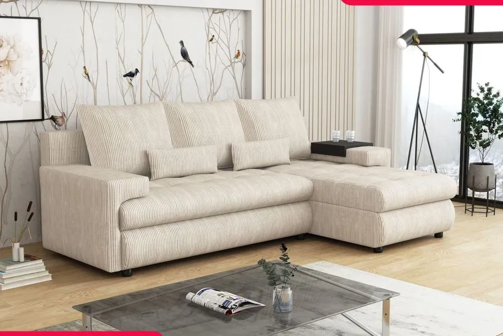 Kategorie: Sofas - PL MARKET - GTIN:5907196083709 - Ecksofa COMO mit Schlaffunktion, Bettkasten & praktischer Kaffeeablage in weichem Cordstoff POSODas Ecksofa COMO ist mehr als nur ein Möbelstück es ist ein echtes Multitalent für stilbewusste Wohnräume. Mit seinem modernen Design, einem robusten Cordstoffbezug (POSO) und cleveren Funktionen passt es sich flexibel Ihrem Alltag an. Neu mit dabei: eine integrierte Kaffeeablage, die das Sofa zur perfekten Chill-Out-Zone macht ideal für gemütliche Kaffee-Momente oder das Ablegen kleiner Snacks und Accessoires.Dank der großen Sitzfläche und komfortablen Rückenlehne lädt das Sofa zum Entspannen ein. Die integrierte Schlaffunktion macht aus dem Sofa im Handumdrehen ein bequemes Gästebett, während der großzügige Bettkasten zusätzlichen Stauraum bietet für ein aufgeräumtes Zuhause.Highlights auf einen Blick:Stilvolle Eckcouch mit klaren Linien und modernem LookBezogen mit weichem, strukturiertem Cordstoff POSO trendig, robust & hautfreundlichNeu: Integrierte Kaffeeablage perfekt für Getränke, Bücher & Co.Praktische Schlaffunktion ideal für übernachtungsgästeGroßer Bettkasten viel Platz für Decken, Kissen oder WohnaccessoiresLanglebige Konstruktion mit massivem HolzrahmenOptimal für Wohnzimmer, Gästezimmer, Apartments oder JugendzimmerVielseitigkeit trifft KomfortOb für entspannte Abende, spontanen Besuch oder als zentrales Wohnhighlight das Ecksofa COMO mit Kaffeeablage bringt Stil, Funktion und Gemütlichkeit auf den Punkt. Die ... Ein vielseitiges Ecksofa mit Schlaffunktion und Bettkasten in Beige, ideal für kleine Räume oder als Gästebett. ![]() ![]()