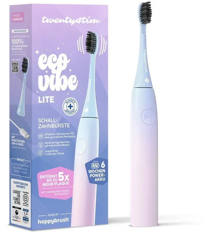 Verfügbarkeit: Auf Lager - Kategorie: Elektrische Zahnbürsten - happybrush - GTIN:4260486336840 - Hochwertige Qualität: 25.000 Vibrationen pro Minute und 3-fach gedrehte Borsten sorgen für eine sanfte und effektive Reinigung deiner Zähne. Nachhaltige Materialien: Die erste nachhaltige Schall-Zahnbürste mit Gehäuse aus 100% recyceltem Plastik und Zahnbürstenköpfe aus nachwachsenden Rohstoffen (ausgenommen Innenteil und Borsten). Leistungsstarker Power-Akku: Mit bis zu 6 Wochen Batterielaufzeit und praktischem Travel-Lock macht die happybrush dein Badezimmer nachhaltiger und ist gleichzeitig deine perfekte Reisezahnbürste. *Vielfacher Testsieger: Schallzahnbürste Eco V3, Testsieger, FAZ Kaufkompass (05/2024), Schallzahnbürste Eco V3, Testsieger mit der Note 'sehr gut' zusammen mit einem weiteren Produkt, öko-Test (05/2023) Inhalt: 1x Elektrische Zahnbürste Eco V3 Sunrise, 1x magnetisches Ladegerät + USB-Kabel, 1x Stecker, 3x Ersatzbürsten. Umverpackungen aus FSC-zertifiziertem Karton. - 39,95 Euro bei Amazon Marketplace Automotive - gefunden von billiger.de Dieses Angebot von MediaMarkt ist eine gute Gelegenheit, die Eco Vibe 3 mit zusätzlichen Aufsteckbürsten zu erwerben. ![]() HAPPYBRUSH Eco VIBE 3 Schall-Zahnbrste + Aufsteckbrsten, Elektrische Zahnbrste Schwarz/Mint, Reinigungstechnologie: Schalltechnologie