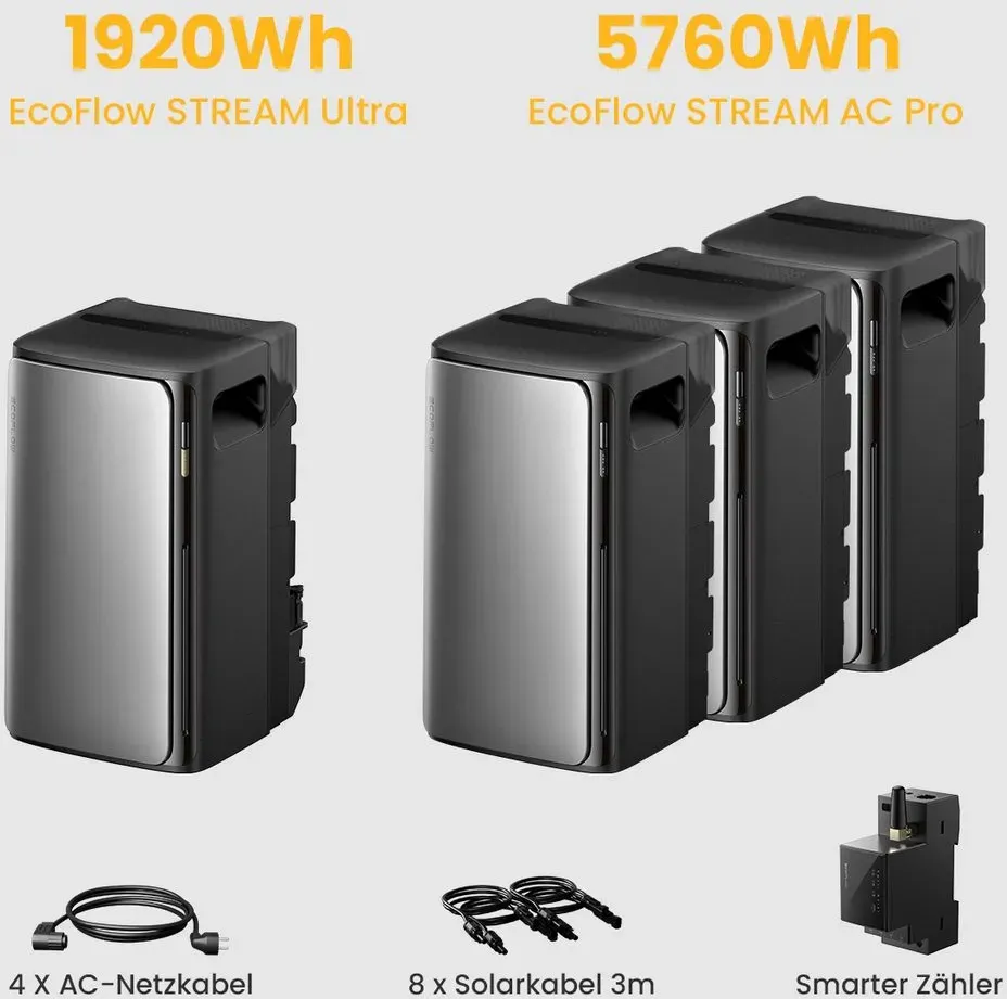 Kategorie: Stromspeicher - EcoFlow - GTIN:4262444684963 - EcoFlow STREAM Ultra + 2 STREAM AC Pro (= 5,76 kWh) inkl. Smartmeter Mit diesem Komplettset steigern Sie Ihre Energieunabhängigkeit auf ein neues Level: Der EcoFlow STREAM Ultra kombiniert sich nahtlos mit zwei STREAM AC Pro Speichern zu einer Gesamt kapazität von 5,76 kWh. Inklusive Smartmeter haben Sie Ihren Verbrauch jederzeit im Blick und können Solarstrom optimal einsetzen effizient, flexibel und intelligent gesteuert. Ihre Vorteile im überblick Gesamtkapazität 5,76 kWh: Perfekt für Haushalte mit mittlerem bis hohem Energiebedarf. Plug-&-Play Installation: Einfach anschließen und starten keine aufwendige Fachinstallation notwendig. Netzeinspeisung bis 800 W pro Gerät: überschüssige Energie wird automatisch ins Hausnetz eingespeist. Intelligente Verbrauchssteuerung: Mit Smartmeter haben Sie volle Transparenz über Stromerzeugung, Verbrauch und Einsparpotenziale. Flexibel & modular: Einzelne Geräte können separat oder zusammen betrieben werden anpassbar an Ihre Bedürfnisse. Zuverlässige LiFePO4-Technologie: über 6.000 Ladezyklen, sicheres Batteriemanagement und lange Lebensdauer. Hohe Effizienz: Mehrere MPPT-Eingänge sichern optimale Solarstromnutzung auch bei wechselnden Wetterbedingungen. Robust & wetterfest: IP65-Schutzklasse für Innen- und Außeneinsatz. Sehr leise: Unter 30 dB Betriebsgeräusch kaum hörbar im Alltag. Smart App-Steuerung: über die EcoFlow-App alles im Blick: Speicherstände, Energieflüsse und ... Dieses Angebot ist empfehlenswert, da es ein umfassendes Set mit EcoFlow STREAM Ultra, zwei Stream AC Pro und vier Solarmodulen für eine leistungsstarke Balkonkraftwerk-Lösung bietet. ![]() ![]() EcoFlow STREAM Ultra + 2 x Stream AC Pro (=5,76kWh) + 4x Solarmodul Full Black 455W