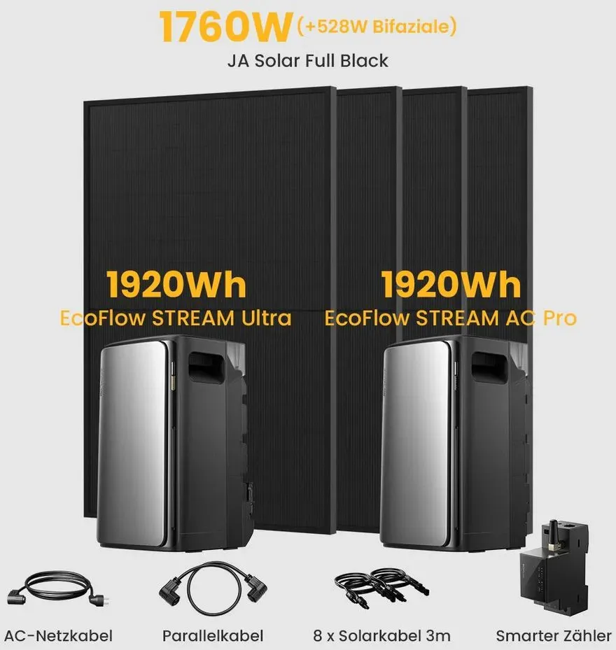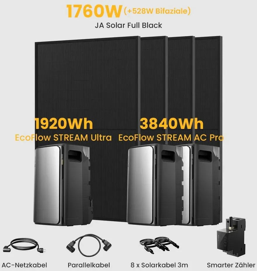Kategorie: Solaranlagen - EcoFlow - GTIN:4262444685014 - EcoFlow STREAM Ultra + 2 STREAM AC Pro (= 5,76 kWh) + 4 455 W Full Black Solarmodule Dieses Set bietet Ihnen eine leistungsstarke Komplettlösung für Ihre unabhängige Energieversorgung: Der EcoFlow STREAM Ultra kombiniert mit 2 STREAM AC Pro Speichern erreicht eine Gesamtkapazität von 5,76 kWh. Zusammen mit vier hocheffizienten 455 W Full Black Solarmodulen nutzen Sie die Sonnenenergie maximal aus, speichern den Strom und senken nachhaltig Ihre Energiekosten elegant, effizient und zukunftssicher. Ihre Vorteile im überblick Gesamtkapazität 5,76 kWh: Ideal für Haushalte mit mittlerem bis hohem Energieverbrauch. Sofort einsatzbereit: Plug-&-Play einfach anschließen, Solarmodule verbinden und loslegen. 4 455 W Full Black Module: Hochwertige, bifaziale Solarmodule mit modernem Full-Black-Design für hohe Erträge und edle Optik. Effiziente Stromnutzung: Mehrere MPPT-Eingänge sichern optimale Solarleistung auch bei wechselnden Wetterbedingungen. Netzeinspeisung bis 800 W pro Speicher: überschüssige Energie wird automatisch ins Hausnetz eingespeist. Modular & flexibel: Speicher und Module jederzeit erweiterbar passt sich Ihrem wachsenden Bedarf an. Zuverlässige Technologie: LiFePO4-Batterien mit über 6.000 Ladezyklen, sicherem BMS und langlebiger Bauweise. Robust & wetterfest: Speicher mit IP65-Schutzklasse und langlebige Solarmodule für dauerhaften Außenbetrieb. Leise & effizient: Unter 30 dB Betriebsgeräusch kaum hörbar im ... Dieses Angebot ist empfehlenswert, da es ein Balkonkraftwerk mit einer sehr hohen Speicherkapazität von 5760Wh durch die Kombination von EcoFlow Stream Ultra und zwei Stream AC Pro Einheiten bietet. ![]() ![]() Balkonkraftwerk mit Speicher 5760Wh, EcoFlow Stream Ultra Speicher mit Stream AC Pro*2 , JaSolar1760W(+528W) Solarmodule für Balkonkraftwerk