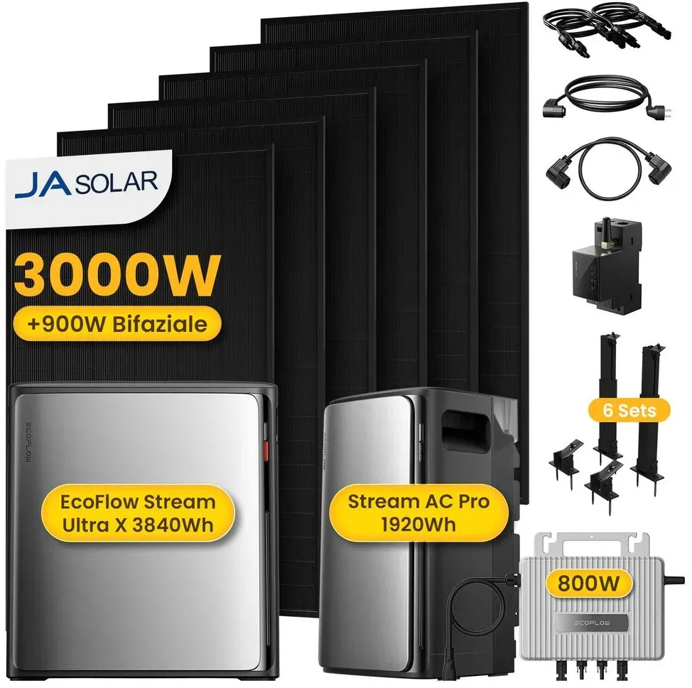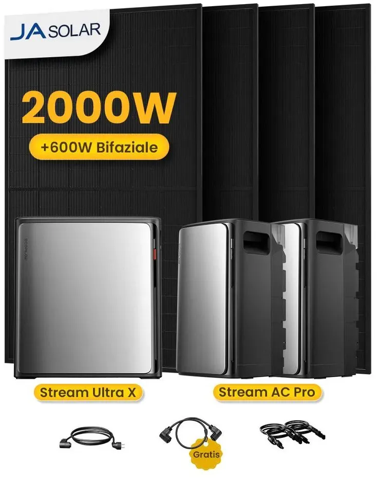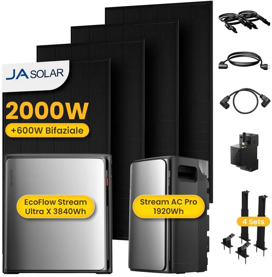 Verfügbarkeit: 13-15 Werktage - Kategorie: Stromspeicher - EcoFlow - GTIN:4262554474423 - Lieferumfang: Alles für den sofortigen Start 1x EcoFlow STREAM Ultra X 3,84 kWh Speicher 4x JA Solar 500Wp Full Black Bifaziale Glas-Glas Solarmodule 1x EcoFlow STREAM AC Pro 1x EcoFlow STREAM Parallelkabel 1x EcoFlow Smart Meter 4x Powerness Flachdach-Halterung (4 Sätze, schwarz) Optimale Flachdach-Montage: Verstellbarer Winkel 15-30° Die Flachdach-Halterung bietet durch verstellbaren Neigungswinkel von 15-30° optimale Energieausbeute. Erweiterbares System: Parallelbetrieb für mehr Leistung Durch das STREAM Parallelkabel können Sie zwei STREAM AC Pro Geräte parallel anschließen und so die Gesamtleistung Ihres Systems deutlich steigern. Ideal für Haushalte mit höherem Energiebedarf. Hocheffiziente Solarmodule: 2000W mit bifazialer Technologie Die vier JA Solar 500Wp bifazialen Glas-Glas Module liefern bis zu 2000W Spitzenleistung. Die bifaziale Technologie nutzt Licht von Vorder- und Rückseite und steigert den Ertrag um bis zu 30%. Â0% MwSt. ausgewiesen.(ohne Mwst.) Wichtig: In diesem wird davon ausgegangen, dass Sie gemäß Gemäß § 12 Abs.-Satz von 0% zu erwerben. Ab dem 1.-frei gemäß § 12 Abs. Warum Powerness wählen: Bei Kontakt mit unserem technischen Support (online oder telefonisch unter +49 1625688967 / +49 1525 7918463) nennen Sie bitte Ihre Bestellnummer und die Seriennummer der Geräte (Die Seriennummer finden Sie auf dem Gerätelabel.)€“ so ermöglichen ... Ein Balkonkraftwerk mit 3000W JASolar Modulen und dem EcoFlow STREAM Ultra X Speicher mit STREAM AC Pro, das eine hohe Leistung und Speicherkapazität kombiniert. ![]() ![]() Powerness®Balkonkraftwerk mit Speicher, EcoFlow STREAM Ultra X Speicher mit STREAM AC Pro,3000W JASolar Modulen & Halterung, Mikro-Wechselrichter ...