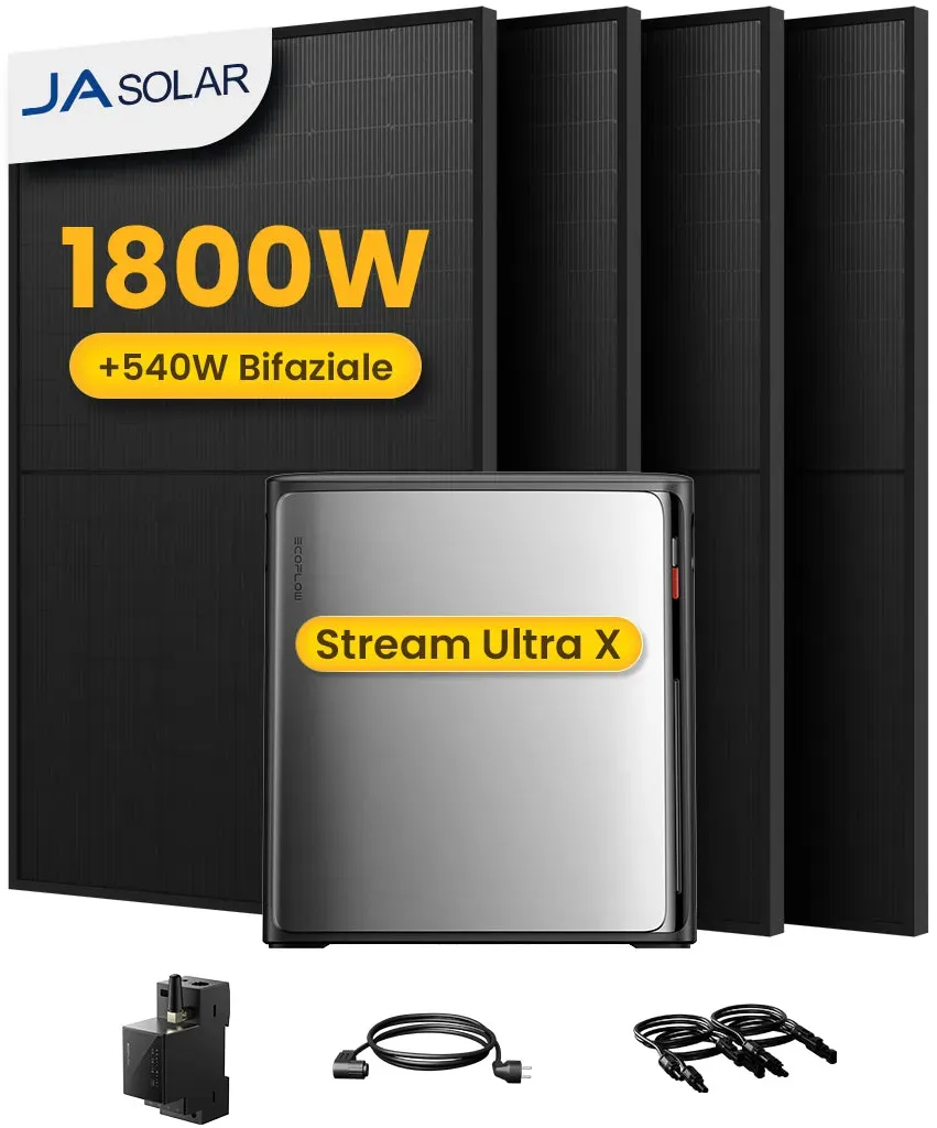 Zustand: Neu - Netzgebundene Systeme Netzgebundene Photovoltaikanlagen - EF ECOFLOW - STREAM UltraX Stream Ultra X Renew - EAN: 0842783190918 - [0 % MwSt] Der Preis ist bereits mit 0% MwSt. ausgewiesen. Der Preis gilt nur für Privatkunden, die Voraussetzungen für eine umsatzsteuerfreie Lieferung nach § 12 Abs. 3 UstG erfüllen. Bei Geschäftskunden wird zusätzlich 19% MwSt. fällig und dem Kaufpreis aufaddiert. Sparen Sie jährlich 1993 € Stromkosten: STREAM Ultra X überzeugt mit einem starken Solareingang, 4-MPPT-Design unterstützt 2000W Solareinspeisung und zusätzlich 800W über angeschlossene Mikro-Wechselrichter. Zwei AC-Anschlüsse (1200-2300 W) versorgen gleichzeitig 99 % aller Haushaltsgeräte - für maximale Ersparnis bei minimalem Aufwand. Solarenergie für drinnen, Plug & Power überall: STREAM Ultra X nutzt AC-Kopplung-Technologie und lassen sich flexibel im Innenbereich platzieren. Einfach anschließen und gespeicherte Solarenergie direkt für Kühlschrank, Waschmaschine oder Kaffeemaschine nutzen. Flexible Kapazität, einfache Erweiterung: STREAM Ultra X lässt sich mühelos von 3,84 kWh auf bis zu 23 kWh erweitern. Die maximale Kapazität beträgt 6 Einheiten. Sicher, Langlebig und Platzsparend: Die LFP-Batterie gewährleistet 1 Haltbarkeit mit 6000 Ladezyklen. IP65 wasserdicht und funktioniert sie zuverlässig selbst bei Temperaturen bis -20 °C. Sie ist für den geräuscharmen Betrieb ausgelegt und stört nicht die Ruhe in Ihrem Zuhause. Mit einer Breite von nur 30 cm passt das ... Dieses Angebot ist das günstigste Komplettset mit 4x 450W JA Solar Bifazialen Solarmodulen und dem EcoFlow Stream Ultra X. ![]() ![]() EcoFlow Stream Ultra X, All-in-One Speicher für Balkonkraftwerke, mit 4 x 450 JA Solar Bifaziale Solarmodule, by Powerness