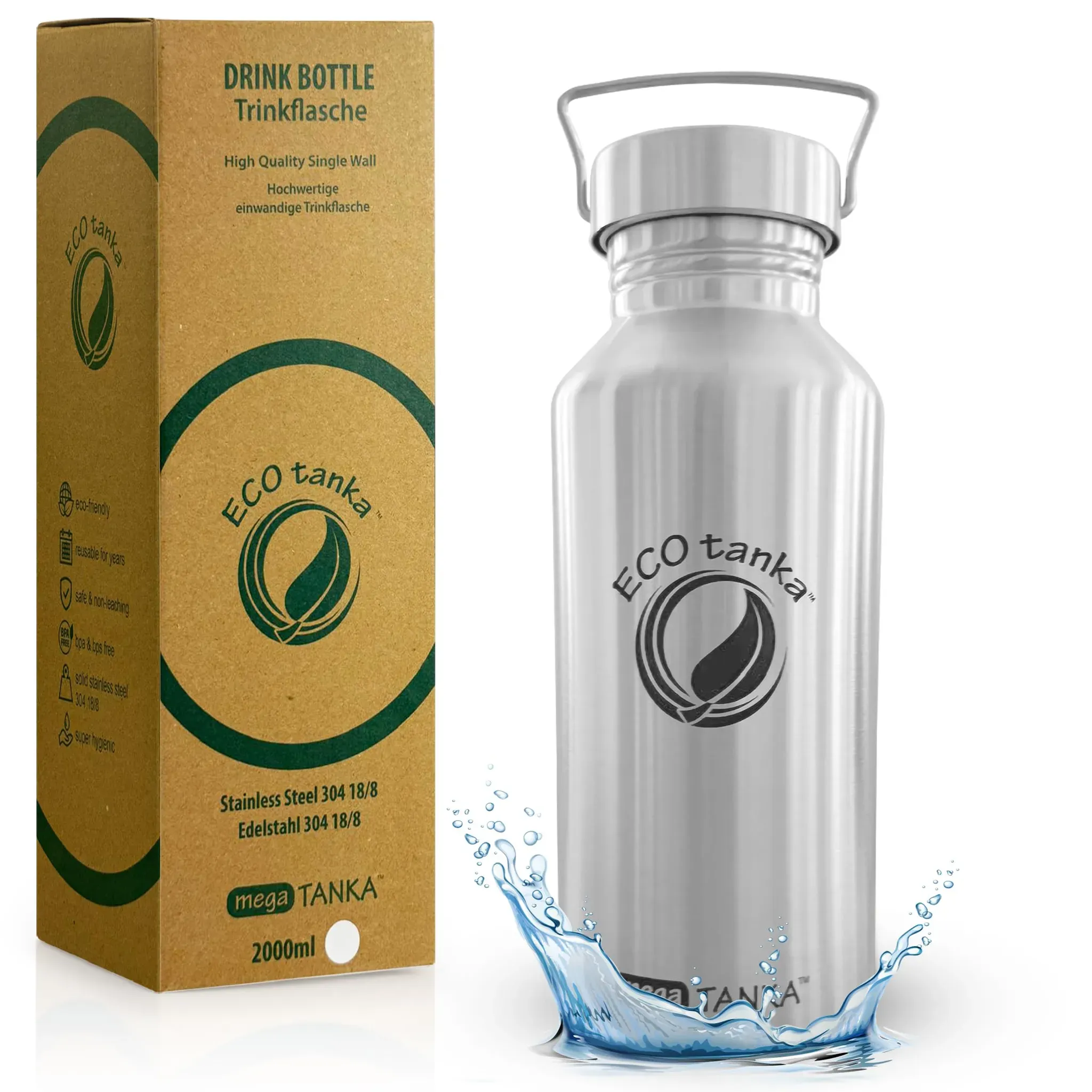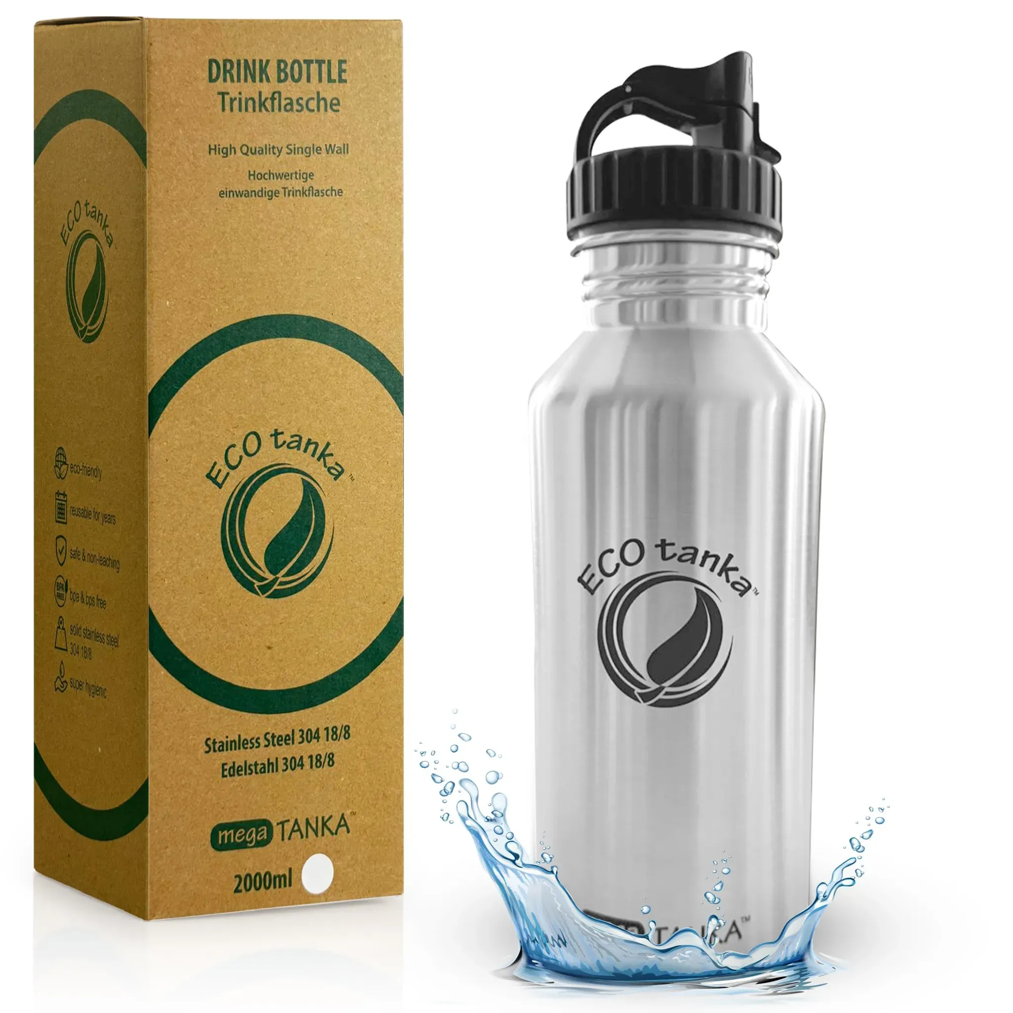 Kategorie: Trinkflaschen - ECOtanka - GTIN:0609465325163 - Maximale Kapazität: Die ECOtanka MegaTANKA ist eine große 2-Liter-Wasserflasche für Sport, Outdoor-Aktivitäten und den täglichen Gebrauch. Einmal füllen und den ganzen Tag hydratisiert bleiben - perfekt für lange Tage ohne ständiges Nachfüllen PREMIUM EDELSTAHL - Hergestellt aus lebensmittelechtem 304 Edelstahl, frei von BPA und Schadstoffen. Diese 2L Edelstahl Wasserflasche ist rostbeständig, geschmacksneutral und sicher für Ihre Gesundheit. FüR SPORT & ABENTEUER - Ob als Fitness-Wasserflasche, Gym Flasche, oder Outdoor Trinkflasche - robust, auslaufsicher und leicht zu transportieren. Perfekt für Workouts, Reisen und Wandern. Leicht zu reinigen Breite öffnung und glatte Innenwände für mühelose Reinigung von Hand oder in der Spülmaschine. Ihre 2-Liter-Wasserflasche bleibt hygienisch und einsatzbereit. NACHHALTIG & LANGLEBIG - Wiederverwendbare, plastikfreie 2-Liter-Wasserflasche mit einer Lebensdauer von über 10 n. Für umweltbewusste Menschen die richtige Wahl. Hinweis: nicht für starke Kohlensäure geeignet. - 44,90 Euro bei Amazon Marketplace Home - gefunden von billiger.de Die 2 L megaTANKA ist die größte Trinkflasche und eignet sich hervorragend für lange Tage oder den Sport mit hohem Flüssigkeitsbedarf. ![]() ![]() ECOtanka megaTANKATM 2 L Edelstahl Trinkflasche 2L, BPA-frei & Auslaufsicher Nachhaltige Trinkflasche für Sport, Outdoor, Fitness & Gym Wasserflasche 2 Liter mit Edelstahlverschluss