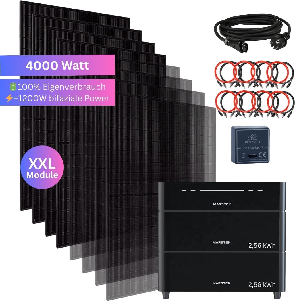 Kategorie: Stromspeicher - myvoltaics einstecken. fertig. - GTIN:4262414423806 - Der Speicher 2026 mit richtig viel Power! – Marstek Venus D Serie Profimodell mit bis zu 4000 Watt Ladeleistung und 2200 Watt entladen je nach Bedarf. Neuste Generation an Speichern von Marstek. Der sogenannte Venus D . Rechnet sich bereits nach n 5,12 kWh im Set, jederzeit erweiterbar. 4000 W Solareingang , 4 MPPT. Das heißt jedes Modul wird einzeln angesteuert. Bis zu 2500 Watt Notstrom 6000 und mehr Voll-Zyklen Lebensdauer Einfaches Setup – kein Elektriker erforderlich. Nulleinspeisung mit Shelly oder Smart-Meter möglich (gratis dabei) Lieferumfang 1x Marstek Venus D Steuerungseinheit 4x Schwachlichtmodule 500 Watt SunPro Power 1x EcoTracker für Nulleinspeisung gratis dabei 2x Speicherblöcke (5,12 kWh) 1x Flachdach Halterung für alle Module 1x Anschlusskabel 2m + alle Verbindungskabel 1x Anleitung Technische Daten Speicher: Kapazität: 5,12 kWh je Block 2,56 kWh Lebenszyklen: 6.000 Zyklen und mehr Notstromsteckdose: bis 2500 Watt MPPT: 4 PV Eingangsleistung: 4000 Watt (entspricht 8 Module) Betriebstemperatur: -20°C bis 55°C Verbindung: WLAN/Bluetooth IP-Schutzart: IP65 Abmessungen: 40cm × 30cm × 10cm Gewicht: 18 kg Technische Daten Solarmodul: Solartyp: TopCON Technologie – Bifazial – Glas/Glas Wirkungsgrad: 23% max. Gesamtleistung Vorderseite (in Watt): 2000 (je 500W) max. Gesamtleistung Rückseite (+30%) (in Watt): 600 (je 150W Maße pro Modul: 1,96 x 1,13 m Gewicht pro Modul (in kg): 27 kg ... Dieses Premium-Balkonkraftwerk-Set mit 4000 Watt und großem Speicher inklusive EcoTracker IR ist die Top-Option für maximale Energieerzeugung und -speicherung. ![]() ![]() myvoltaics einstecken. fertig. MyVoltaics® 4000 Watt Balkonkraftwerk SET MIT SPEICHER Marstek Venus D 5,12 kWh & EcoTracker IR Smartmeter
