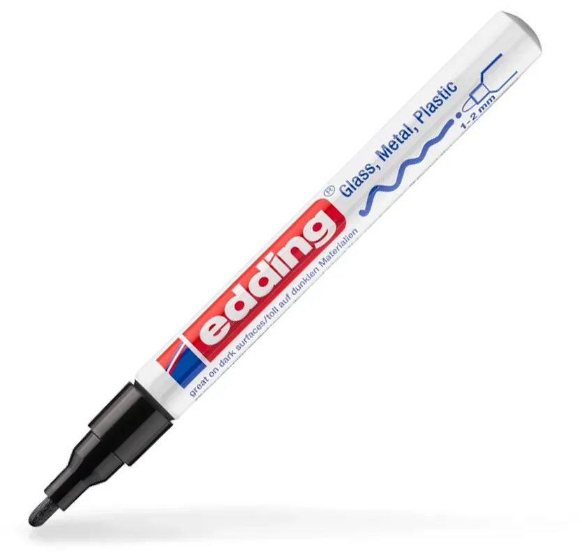 22 Händlerangebote bei billiger.de - Kategorie: Sonstige Schreibgeräte - edding - Edding 751, Weiß, Weiß, 1 mm, 2 mm, 1 Stück(e) Edding 751. Schreibfarben: Weiß, Produktfarbe: Weiß, Strichbreite (min): 1 mm. Menge pro Packung: 1 Stück(e) Gestalten und dekorieren auf glatten Untergründen - dafür sind die edding Glanzlack-Marker optimal. Dieser Glanzlack-Marker mit seiner bis zu 2 mm breiten Spitze ist dabei der feinsinnige Gegenpart zum edding 750, dessen Spitze für großzügigeres, flächiges Gestalten unschlagbar ist. Mit der zarteren Spitze des Glanzlack-Markers können Sie detaillierte Schriftzüge und Dekorationen, zum Beispiel auf Glasflaschen, Christbaumkugeln, Keksdosen oder Aufbewahrungsboxen aufbringen. Seine lackartig deckende Tinte deckt und hält perfekt. Der Glanzlack-Marker ist in strahlenden Farben erhältlich. Für noch detailliertere Gestaltungsideen ist der sehr feine edding 780 Glanzlack-Marker gedacht. Der edding 751 Glanzlack-Marker ist mit einer 1-2mm breiten Rundspitze ausgestattet. Die Anwendung ist unkompliziert: Kräftig schütteln, Kappe abnehmen, die Spitze auf ein Testpapier aufsetzen und vorsichtig auf- und abpumpen, bis sich die Spitze mit Tinte füllt, dann losschreiben! Das Arbeiten mit diesem Stift ist durch die geruchsarme Tinte angenehm. Zudem ist sie wasser-, abrieb-, licht- und hitzebeständig. Die Spitze des Glanzlack-Markers ist austauschbar. Glanzlack-Marker - GTIN:4004764017607 Dieser schwarze Lackmarker ist eine sehr preiswerte Einzeloption für den täglichen Gebrauch. ![]() ![]() Schwarz 1-2 mm | edding 751 Lackmarker